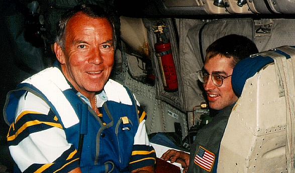 Bud Southworth and Flight Deck Director ABH1 Chuck Meeuwsen. Flight Deck Director ABH1 Meeuwsen assisted Bud Southworth on the Kennedy's fantail area while observing carrier landings. Thanks Chuck!!! May 2, 1998 Ltjg. Wesley Joshway Photograph.