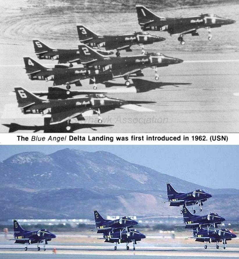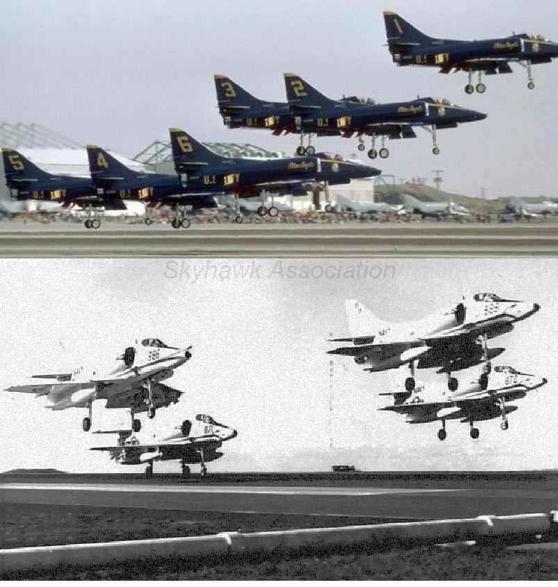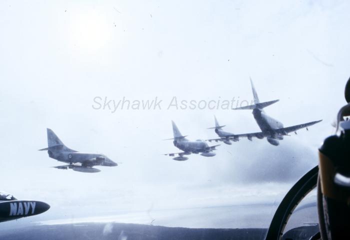 Events 10 APR 1945: Served as a communication unit, making flights within Australia. 01 JUN 1955: Serves as a fixed wing training unit. OCT 1956: Provides training for operations with HMAS Melbourne, using Sea Venom and Gannet aircraft. 1959: 724 Squadron forms an aerobatic team called the "Ramjets", flying "Sea Venoms". 1963-68: 724 Squadron performs all-weather attack, anti-submarine and flight training. 1967: The United States sold 20 Skyhawks to Australia for the Royal Australian Navy. Eight new A-4Es and two TA-4Fs were delivered in 1967. The remaining 10 aircraft (eight refurbished A-4Fs and two TA-4Fs) were delivered in 1971. The Australian Skyhawks were designated A-4G and TA-4G. 1969: A demonstration team, performed with A-4G Skyhawks during "Airday - 1969". Comments from a former RAN Skyhawk Driver: "The RAN A4Gs began flying in 1968. By 1969 VF 805 was ready to go to sea on the newly refurbished HMAS Melbourne with VC 724 continuing to train the backlog of pilots to the A4G. Each squadron had a tradition of forming their own aerobatic teams when conditions allowed. Previously in the Sea Venom era, the then 724 squadron had a team of Sea Venoms named the "RamJets". These aircraft landed in a 4 Diamond formation. I'm not certain when they (or the equivalent 805 squadron team the "CheckMates") started their displays; but I'm told that the 4 Diamond landing was a feature of the display. For the Sea Venom with excellent "non-skid" (maxarette) brakes the landing on our 6,000 foot long runways at NAS Nowra was not a problem. I believe that 6,000 feet was the minimum required USN runway length for safe A4 operations. In 1969 the now VC 724 'RamJet' pilots had limited numbers of A4Gs to work with. At first the RAN purchased only 8 single seaters and 2 trainers. Later another order of the same number of aircraft arrived by the end of 1971 for a total of 20 Skyhawks. VF-805 took all their aircraft and some of VC-724 aircraft sometimes to keep always their required number of serviceable aircraft, consequently the RamJets often were scrambling to have 3 A4Gs available for practice, sometimes they could muster 4. When 4 single seats were available then they would practice their 4 aircraft diamond landing and other pilots were allowed to sit in on their briefings, (and often hilarious debriefings), before their display practice. [The differing numbers of aircraft in each squadron are not specified as this number frequently changed.] The core team at that time was LCDR Bill "Sailor" Callan, LCDR Grahame "Dusty" King (both had been members of the Sea Venom aerobatic teams) with Leut Errol "Clump" Kavanagh (later served on 2 years exchange with VT 21 at NAS Kingsville). Whenever a 4th aircraft was available then a senior pilot (usually with Sea Venom experience) was in the No.4 slot. Sometimes other members rotated into the No.4 slot to see what the issues were flying there, particularly for the 4 Diamond landing. We used to be famous in Australia for our Merino wool sheep, hence the 'Merino Ram Head' in the RamJets badge. BuNo 154910, RAN 889, BuNo 155055, RAN 872, BuNo 154907, RAN 886, BuNo 155052, RAN 871 are in the top photo.