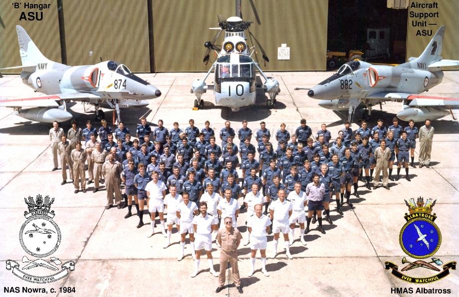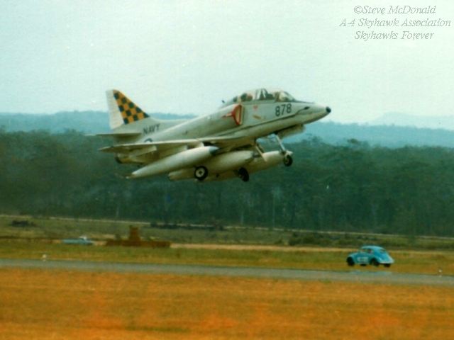 Unit Photos FEB 1970: Phil Thompson: VC-724 OFS pilots, FEB 1970. (L to R) LEUT B.J. Daly, LCDR C. Patterson, LEUT Peter McNair, ASLT Phil Thompson, and Leut John Hamilton. Date unknown: L to R: BuNo 154648 #879, 155063 #876, 154904 #883 and 154905 #884. RAN photo. 1970s: Royal Australian Navy Skyhawk BuNo 154905, #884 in formation with two unknown VC-724 Squadron Skyhawks. Unknown photographer, possibly Michael Sandberg. Date unknown: Royal Australian Navy Skyhawk BuNo 154905, #884. 1971: VC-724 pilots, Leut W.E. Symons, SubLeut M.J. Symthe, and Leut E.M Kavanagh at NAS Nowra in 1971. Note the tail of VF-805 aircraft, BuNo 154909 #888, in the background. From Phillip Thompson. JAN 1972: VC-724 pilots, (L to R) LEUT B.J. Daly, LCDR C. Patterson, LEUT R. McNair, LEUT P. Thompson, and Leut J. Hamilton. Photo from Phil Thompson 1972: BuNo 155062, 875, BuNo 155051, 870 and BuNo 154912, 881 banking left in formation. From Phil Thompson. JUN 1972: Operational Flight School No.6 pilots. May 1974: Royal Australian Navy Skyhawk BuNo 154909, #888, parked on the ramp. Joe Cupido, G. Verver collection. May 1974: BuNo 155062, #875, parked on the flight line. Gary Verver Collection May 1974: Australian Navy Skyhawk BuNo 154907, #886, parked on the ramp with practice bombs and drop tanks. Gary Verver Collection May 1974: TA-4G BuNo 154912, #881. Gary Verver Collection 26 June 1977: BuNo 155051, #870, parked on the flight line with a centerline tank and Sidewinder missiles. Gary Verver Collection. 1978: VC-724 Skyhawk BuNo 154647, #878, as the gear comes up shortly after takeoff. Photo from Steve McDonald. 1978: BuNo 154647, #888, as she taxis by the photographer during an air-show. Photo from Steve McDonald. OCT 1978: Australian Navy 724 Squadron Skyhawk BuNo 154911, #880. R.A. London Date unknown: Sept 1979: BuNo 154907, #886 rolled off the deck of the HMAS Melbourne in a storm 355km off east Australian coast on 09/79. Gary Verver Collection Date Unknown: BuNo 155051, #870, parked on the flight deck. Gary Verver Collection Early 1983: just prior to Skyhawk retirement, John Bartels finishing his last A-4 flight in BuNo 155069, #877. John Bartels JUN 1983: VC-724 A-4G Skyhawk BuNo 154909, 888, in formation with, and taken from, a Macchi trainer. A series of photos taken by John Bartels from a Macchi trainer in June of 1983. My best guess is that the A-4G on the port side of the formation is 154909, #888. According to Phil Thompson, the photo of RAN Macchi MB326H behind an A4G Skyhawk was taken on the last 'farewell' flyby (up and down the coast near Nowra) when all the aircraft were available during June 1983. After this the Macchis were transferred to the Royal Australian Air Force (RAAF) who used the Macchis as advanced trainers and Forward Air Control aircraft. Only four (two trainers and two single seats) of the A4Gs flew from that time with the rest going into storage until all ten were sold to RNZAF (Royal New Zealand Air Force) in June 1984. Off-Duty Photos John Bartels, former Skyhawk pilot, in Qantas uniform. John Bartels back in-the-day. |
