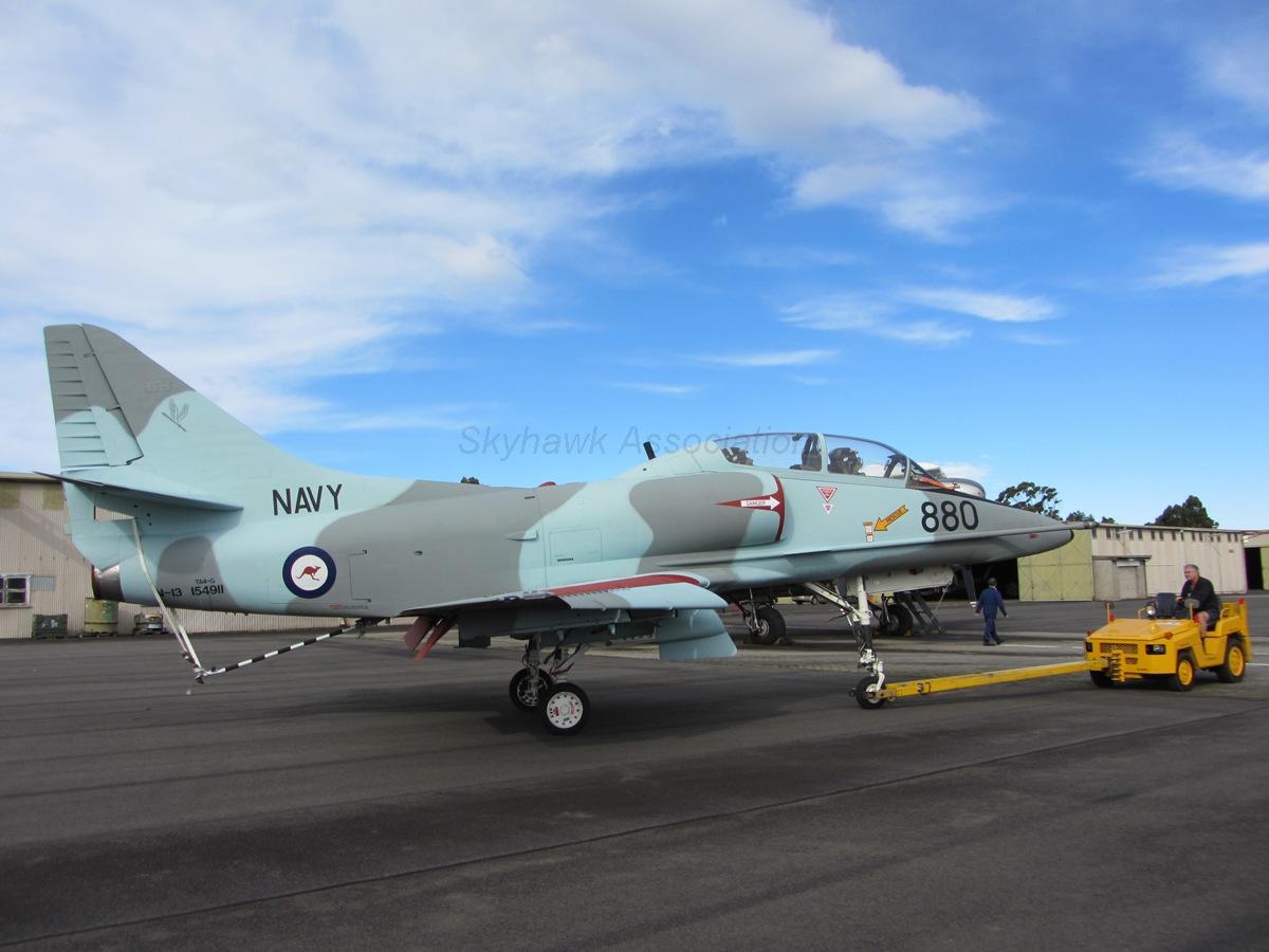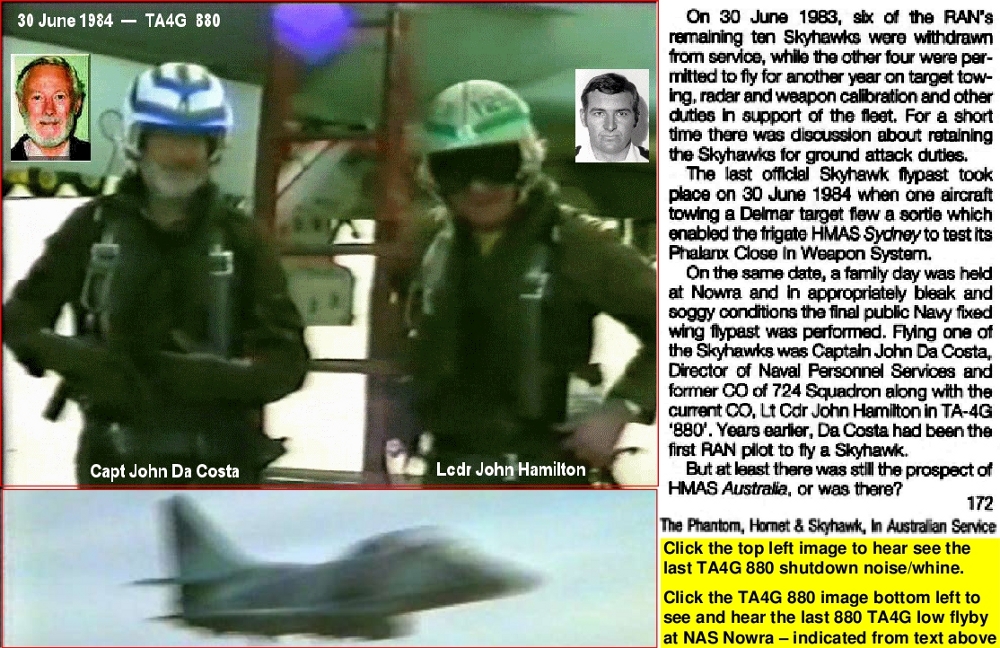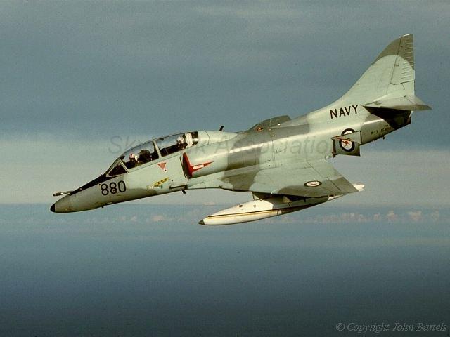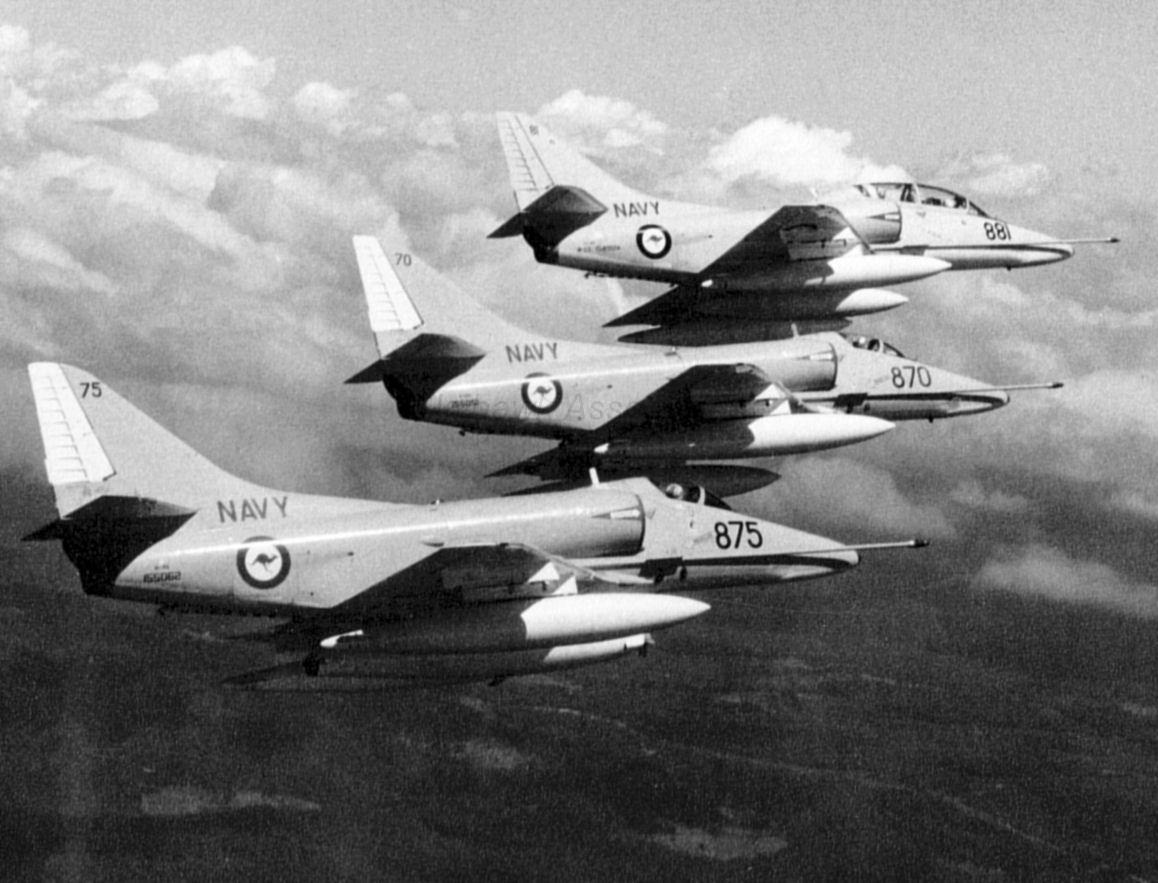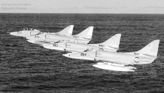 Circa 1970: 724 Squadron utilizes its Skyhawks to form a new aerobatic team called the "Checkmates". JUN 1982: HMAS Melbourne is decommissioned and the need for the Navy's fixed wing units disappears. JUL 1982: 724 Squadron receives 805 Squadron's Skyhawks. 30 JUN 1984: 724 Squadron is dis-established and it's Skyhawks are sold to the Royal New Zealand Air Force. |