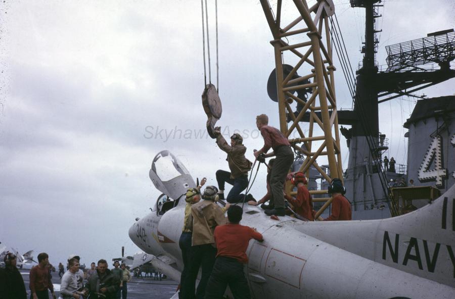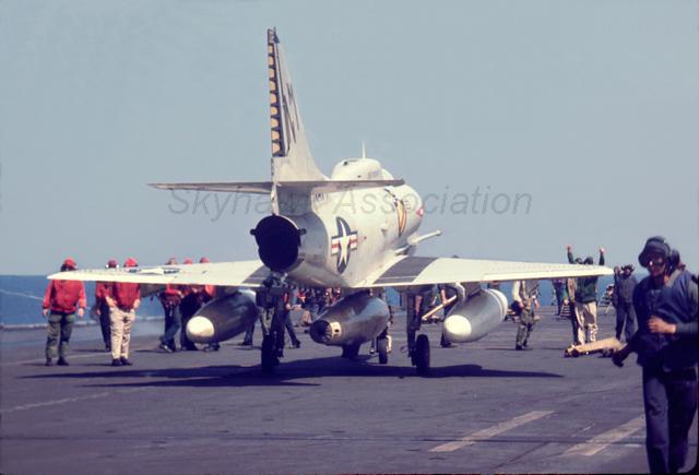 28 October 1965: VA-23 Black Knights A-4E Skyhawk BuNo 152017, NE-336, piloted by Cdr. Robert R. King of Pomona, CA, (VA-23 CO), fires 2.75-inch rockets at Viet Cong targets in Vietnam. Official U.S. Navy photo. 1965: VA-23 A-4E BuNo 152046, NE-xx, 1965 USS Midway. Photo from Melly Jones, G. Verver Collection. 1965: VA-23 Black Knights A-4E Skyhawk BuNo 151143, NE-343, with the hook and gear down and the speed breaks out. Official U.S. Navy photo. Flown by CDR Robert R. King of VA-23 BuNo 152017 Skyhawk unloads a savo of 3 inch rockets against the Viet Cong. USN Photo provided by Gary Verver FEB66: 1966: Formation of four VA-23 A-4E Skyhawks, possibly over California. NAN Photo from Gary Verver. 1966-1967: VA-23 A-4E BuNo 151168 taxiing forward for a launch aboard the Coral Sea. Visible behind 168 is VA-22 A-4C BuNo 147761. Probably between Aug 1966 and end of Feb 1967 as that is when VA-22 and VA-23 were on the Coral Sea. From Gary Verver. August 1966: Skyhawk formation of Black Knights BuNo 151143, NE-343, BuNo 149962, NE-338, BuNo 149963, NE-347 and Redcocks BuNo 147844, NE 226. John Champlin via "Boom" Powell. November 26, 1966: Lt. Jerry P. Shafer was forced to land A-4E BuNo 151120, NE-340, into Coral Sea's barricade after a combat strike near Haiphong in North Vietnam. BuNo 151120 was hit in the left wing, was on fire at different times in the flight, and was very low on fuel. NOV66 NAN photo1; NOV66 NAN photo2 - Pic1; Pic2; Pic3; Pic4; Pic5; Pic6; Pic7; Pic8; Pic9; Pic10. Photos from Gary Verver. - left rear view of BuNo 151120 on the Coral Sea flight deck.