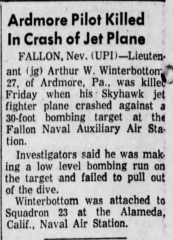 Events 1947: Cdr. L. Cook Cleland won his first Thompson Trophy at the Cleveland National Air Races. Commander Cleland won the Thompson Trophy again in 1949. His two Thompson Trophies rank him second only to Roscoe Turner the ace of the Cleveland National Air Races. December 1949: Reserve Fighter Squadron SIX HUNDRED FIFTY-THREE (VF-653) established with LCdr. Cook Cleland commanding at NAS Akron, Ohio. VF-653 was assigned the FG-1D Goodyear Corsair I. February 1, 1951: Reserve Squadron VF-653, the Dragons were called to active duty. April 16, 1951: Fighter Squadron SIX HUNDRED FIFTY-THREE --- VF-653 was re-assigned to NAS Alameda, California. By May, VF-653 had been assigned the Vought F4U-4 Corsair I. October 12, 1951 through August 5, 1952: Fighter Squadron SIX HUNDRED FIFTY-THREE --- VF-653 flying the F4U-4 and F4U-4B Corsair with ATG-1 deployed to the Western Pacific and Korea on USS Valley Forge CV 45. This was the Dragon's first combat cruise to Korea. December 11, 1951: VF-653 conducted its first combat strikes in the Korean War. August 28, 1952: VF-653 was assigned the Grumman F9F-2 Panther. February 4, 1953: VF-653 was re-designated as VF-151 - Fighter Squadron ONE HUNDRED FIFTY-ONE, the Black Knights. March 30, 1953 through November 28, 1953: Fighter Squadron ONE HUNDRED FIFTY-ONE --- VF-151 flying the Grumman F9F-2 Panther with ATG-1 deployed to the Western Pacific and Korea on USS Boxer CVA 21. This was the Black Knights' Second combat cruise to Korea. May 1, 1953: At Yokusuka (near Tokyo) - May Day was only base liberty because of Communist riots in the area. May 13 through July 27, 1953: VF-151 with fourteen Grumman F9F-2 Panthers and 22 pilots engaged their first Korean War line period on Boxer. During this period the Black Knights participated in 120 strikes in which the squadron had 33 Panthers hit by flak, 19 of those Panthers were damaged beyond repair. During combat the squadron expended 122,535 20mm cannon rounds, 1,152 five inch rockets, and dropped 3,112 bombs weighing 624,080 pounds. During the period each pilot averaged 46 missions. VF-151 pilots: Commanding Officer LCdr. John Rickabaugh, Executive Officer LCdr. Carl Roberts, Operations Officer LCdr. Herky Harper, Lt. Bob Brown, LSO Lt. Les Burton, Lt. Chuck Chute, Lt. Bill Fornoff, Lt. Max Malen, Lt. Mike Martin, Lt. Cal Russell, Lt(jg) Digger Doyle, Lt(jg) Jack Ingram, Lt(jg) Pat Kittler, Lt(jg) Jim McCarty, Lt(jg) Sam McKee, Lt(jg) Rusty Merrill, Lt(jg) Burt Shepperd, Lt(jg) "Super Secret" Smith, Ordinance Officer Ens. Al Bedford, Ens. Ken Cameron, Ens. Tom Ledford, Ens. Lou O'Neil, Ens. Roger Pattridge, Ens. Roger Sheets. July 25, 1953: VF-151 Black Knight Lt(jg) Jack William Ingram, Jr., United States Navy, born January 10, 1928, 496331, flying a Grumman F9F-2 Panther was hit by antiaircraft fire (Triple A) north of Hungnam, North Korea. Lieutenant Ingram nursed his Panther to the Korean Sea before trying to ditch --- Lieutenant Ingram did not survive the resulting crash and was Killed In Action. July 26, 1953: VF-151 Black Knight Ens. Thomas Franklin Ledford, United States Navy, in a Grumman F9F-2 Panther received a USS Boxer CVA 21 "Cold Cat." The Boxer's catapult failed to accelerate Ledford's Panther to flying speed and the Panther fell from the Boxer's bow, into the sea, upside down. Boxer then passed over the sinking plane killing Ledford. Ens. Tom Ledford was probably the last United States Naval Aviator killed in the Korean War. September 1, 1954 through April 11, 1955: Fighter Squadron ONE HUNDRED FIFTY-ONE --- VF-151, Black Knights flying the Grumman F9F-2 Panther with ATG-1 deployed to the Western Pacific on USS Wasp CVA 18. This was the Black Knights' third cruise to the Western Pacific. February 1955: VF-151 provided air support during the evacuation of Chinese Nationalists from the Tachen Islands following the their bombardment by Communist China. May 1955: VF-151 was assigned the "Last Chance" Vought F7U-3M (Gutless) Cutlass. February 7, 1956: VF-151 was re-designated as VA-151 - Attack Squadron ONE HUNDRED FIFTY-ONE, the Black Knights. May 25, 1956 through December 20, 1956: Attack Squadron ONE HUNDRED FIFTY-ONE --- VA-151 flying the "Last Chance" Vought F7U-3M (Gutless) Cutlass with ATG-1 deployed to the Western Pacific on USS Lexington CVA 16. December 1956: Attack Squadron ONE HUNDRED FIFTY-ONE Black Knights were assigned the F9F-8B Grumman Cougar. July 1957: VA-151 was assigned the North American FJ-4B Fury. October 4, 1958 through February 2, 1959: Attack Squadron ONE HUNDRED FIFTY-ONE --- VA-151, Black Knights flying the North American FJ-4B Fury with ATG-1 deployed to the Western Pacific on USS Ticonderoga CVA 14. February 23, 1959: VA-151 was re-designated as VA-23, Black Knights - Attack Squadron TWENTY-THREE. August 15, 1959, through March 25, 1960: Attack Squadron TWENTY-THREE --- VA-23, Black Knights flying the North American FJ-4B Fury with CVG-2 deployed to the Western Pacific on USS Midway CVA 41. May 18, 1960: Attack Squadron TWENTY-THREE was assigned the Douglas A4D-2 Skyhawk. September 30, 1960: Lt(jg). Arthur W. Winterbottom, 27, of Ardmore, PA, was killed Friday when his VA-23 Skyhawk (Buno 142092) crashed into a 30-foot steel target when he failed to pull out of a dive on a low-level bombing run at NAAS Fallon, NV. Reno Gazette, 01 October 1970. Oakland, CA, Tribune, Friday, September 30, 1960. Lebanon, PA, Lebanon Daily News, Saturday, October 01, 1960 Lt(jg). Arthur W. Winterbottom, 27, was killed when he struck a 30-foot steel target during a low-level bombing run at Fallon. The squadron was engaged in competitive low-level napalm lay down at 500 knots and 50-300 feet altitude. On this run the pilot was at 20 feet on release and failed to clear the top of the billboard and disintegrated into bits and pieces that scattered for almost a mile beyond the target. Naval Aviation News, Grampaw Pettibone, July 1961. February 16, 1961, through September 28, 1961: Attack Squadr