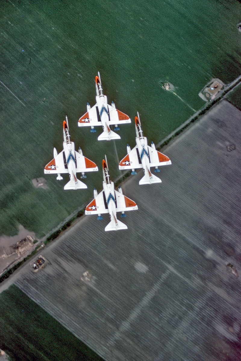 Unit Photos 1971: left front view of Professionals Skyhawk 3H-330 in tension on the cat and ready to go. Harry Gann. 1970-1972: TA4J Skyhawks BuNo 153674, 3H-353, 3H-352, and BuNo 156896, 3H-336, inflight 1970-1972. Dick Nielsen photo. 1970-1972: TA-4J Skyhawk BuNo 156900, 3H-300, Pilot Dick Nielsen, inflight, 1970-1972. Dick Nielsen photo. 30 December 1971: Dick Nielsen in TA-4J Skyhawk BuNo 156896, 3H-336, enroute from NAS Kingsville to MCAS El Toro. Dick Nielsen photos. Pic 1, Pic 2. Early 1972: TA-4J Skyhawks BuNo 156901, XO 3H-301, BuNo 156902, 3H-302, BuNo 156903, 3H-303, (flown by Dick Nielsen who is in command of the flight) and BuNo 156904, 3H-304, in formation. Dick Nielsen photos. Pic 1, Pic 2, Pic 3, Pic 4, Pic 5, Pic 6, Pic 7. circa 1972: Pilots view from a VT-23 Professionals TA-4J Skyhawk on final approach, NAS Kingsville, circa 1972. Dick Nielsen photo. 1974: VT-23 TA-4J. Watching a VT-23 TA-4J approaching the wires in 1974. From a photograph by Harry S. Gann. Black & White of same A-4 Skyhawk as above, with wing tanks for supplementary fuel, approaches for landing on U.S. carrier. Note position of the Tailhook! Looks like the tail-code of the parked scooters ends in H, so maybe the Oriskany or the Kitty Hawk is the "Boat". Douglas photo from Gary Verver Collection that was part of the 27 Feb 1979 News Release from McDonnel Douglas. VT-23 TA-4J. This VT-23 TA-4J, side number 3H-324 is pictured on the Luke Air Force Base Transit Line in the 1970's. From a photograph by Tony Suglio. VT-23 158094, 3H-313, location and photographer unknown. The other a/c in the photo are an A-6, S-2 and C-97. From Gary Verver. Date Unknown: TA-4J 158093 Col Robert Clapp via G. Verver. MAY 1971: VT-23 TA-4J BuNo 156934, 3H-334. Photographer unknown, from Gary Verver Collection. Off-Duty Photos No info yet. |