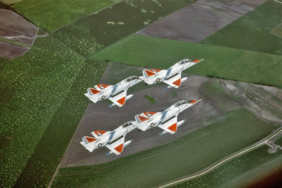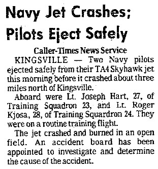 Events November 1, 1958: Advanced Training Unit TWO HUNDRED TWENTY-TWO (ATU-222) was established at Naval Air Station Kingsville, Texas, flying the Grumman F-11 Tiger. November 1958: ATU-222 was assigned the advanced pilot training final phases including: swept wing familiarization, formation flying, all weather instrument flying, tactics and air-to-air and air-to-ground gunnery. May 1, 1960: Advanced Training Unit TWO HUNDRED TWENTY-TWO (ATU-222) was redesignated Training Squadron TWENTY-THREE (VT-23). June 1965: Training Squadron TWENTY-THREE was assigned the Grumman TF-9J Cougar. Carrier qualification and air-to-ground rocketry training were added to the syllabus. April 1970: Training Squadron TWENTY-THREE was assigned the Douglas TA-4J Skyhawk. February 26 1971: Lt(jg). Gary J. Hagstrom, 26, (VT-23) ejected safely from his TA-4J Skyhawk (BuNo 153490) just before it crashed about 1/2 mile south of the NAS Kingsville runway at 10:17 a.m. today. The aircraft was returning from a solo training flight when the accident occurred. Corpus Christi Times, Friday, February 26, 1971. March 4, 1971: Lt. George Hiduk, 26, IP, and Ens. Kenneth Pritchard, 23, (student) ejected safely from their TA-4 Skyhawk (BuNo 152849) shortly before it crashed four miles north of NAS Kingsville at 6:50 a.m. today. Both were taken from the crash site by helicopter. The crash started a small fire in land belonging to the King Ranch. Corpus Christi Times, Thursday, March 4, 1971. Lt. George Hiduk and Ens. Ken Pritchard parachuted to safety Thursday before their TA-4J Skyhawk crashed and burned in an open area near Bishop, TX, in Nueces County. Amarillo Daily News, Friday, March 5, 1971. April 7, 1971: Two Navy pilots ejected safely from their TA4J Skyhawk (BuNo 153688) jet training plane before it crashed shortly after taking off from NAS Kingsville at noon Wednesday. They were Lt.(jg) Edward J. Simmons, 26, of Dayville CN, an instructor; and Marine 1st Lt. James R. Hanneman, 23, of Franklin, WI, a student. Both are attached to VT-22. The two men were picked up by a Navy crash truck. The plane crashed in a field about three miles SE of the base near Baffin Bay. Corpus Christi Caller-Times, Thursday, 08 April 1971. April 26, 1971: Lt(jg). Robert A. Day and Lt(jg). Jon D. Radford ejected safely after their TA-4J Skyhawks (BuNo 156913 & TA-4J BuNo 158089) collided in flight Monday over the Dixie Target Range in South Texas. They were on a practice bombing mission when the collision occurred. Lubbock Avalanche, Lubbock, Texas, Tuesday Evening, April 27, 1971. August 4, 1971: Lt. Richard L. Perry, 30, (IP) Marine 1st Lt. T.L. Holt, 26, (student) ejected safely from their TA-4J Skyhawk (BuNo 156893) when it crashed 20 miles NW of NAS Kingsville at about 7:30 a.m. today. Both were picked up by a helicopter from NAS Kingsville. Corpus Christi Times, Wednesday, August 4, 1971. May 2, 1972: TA-4J Skyhawk BuNo 153509 ... I was on the line crew and in charge of driving the plane captains to and from the needed aircraft. We'd had some rain the last several days so the ground was wet and muddy. TA-4J BuNo 153509 came in and no sooner had it landed it started to veer off the runway. It travel several hundred yards and then went completely off the runway. Since the ground was muddy one of the struts (could have been the nose strut) dug into the mud and the aircraft flipped with the engine still turning. A few seconds later some other instructor pilots jumped into my van and told me to drive. So there I go onto the taxiway and down the runway. When we got there both pilots were standing by the upside down aircraft. I'll never forget the look on the instructor, the Back Seater. He had his helmet in his hand and just looked at us. Mud and water dripping down his face. He looked like "Holy Shit I'm Alive" and a sick looking grin on his face. If I remember right his name was Lt. Bachelor. I don't remember the student or his name. We all knew most of the instructors, if I remember right Lt. Bachelor was the squadron safety officer. The pilots jumped in the van and I took all of them back to the hangar. They eventually hauled the aircraft to an older runway and left it until its transfer. As luck would have it I got the chance to stand guard on it for several hours. Why? I never knew. Because over those hours all sorts of pilots came out to look at it. From Frank Garza. Pic 1, Pic 2, Pic 3, Pic 4, Pic 5, Pic 6, Pic 7, Pic 8. Went to NARF Pensacola 19 September 1972 from VT-23 and was SOC NARF Pensacola 24 July 1975. JUL72: BuNo 153467 3H-368 parked on the ramp. Gary Verver Collection. August 22, 1972: Lt. Joseph Hart, 27, (VT-23) and Lt. Roger Kjosa, 28, (VT-24) ejected safely from their TA-4 Skyhawk (BuNo 156906) this morning before it crashed and burned in an open field about three mile north of NAS Kingsville, TX. The Corpus Christi Times, Corpus Christi, TX, Tuesday, August 22, 1972. October 1972: The Navy switched training concept to parallel flow and the "Single Base Training Concept." VT-23s training mission changed to provided basic flight training in Transition, Precision Acrobatics, Basic Instruments, Radio Instruments, Night Flying, Formation Flying, Air-to-air Gunnery and Carrier Qualification. Training Squadron TWENTY-THREE was assigned the North American T-2C Buckeye to accomplish basic flight training. Advanced flight training was now also accomplished at Naval Air Station Kingsville, Texas. VT-23 graduates went "next door" to VT-21 or VT-22 for advanced flight training in the TA-4J Skyhawk. 1982: Training Squadron TWENTY-THREE was tasked with Grumman E-2 pilot training comprised of 68 training flights in the T-2C Buckeye. In 1985 this task was transferred to VT-4. 199?: Training Squadron TWENTY-THREE was assigned the Boeing T-45C Goshawk. September 30, 1999: VT-23 Professionals were disestablished. Assets were transferred to Training Squadron SEVEN at Naval Air Station Meridian, Mississippi. |
