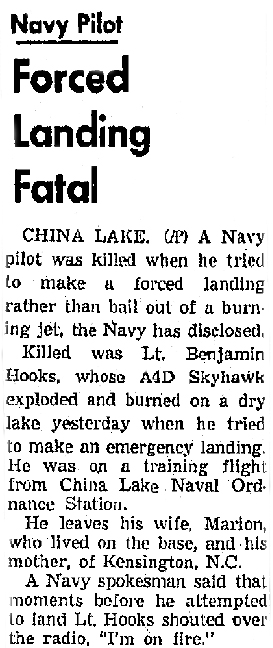 LCdr. Bennett W. Hooks, United States Navy Bennett Hooks attended the United States Naval Academy and was graduated with the 1946 Naval Academy class. Following graduation he served aboard the USS Philippine Sea (CVA-47) as a division officer in the gunnery department for three years. During this period he acted for a short time as an Aide to Admiral Richard E. Byrd on an expedition to the Antarctica. He was then assigned duty with Anti-Submarine Squadron 22 and later served on the staff of Commander Carrier Division Eighteen. During this assignment he served as an Aide to Admiral A. B. Vosseler and Admiral F. T. Ward. LCdr. Hooks next attended the United States Navy Postgraduate School at Monterey, California where he successfully completed the course of instruction in nuclear engineering in June 1955. LCdr. Hooks was assigned duties as a VX-5 Project Officer at Moffett Field and at China Lake. According to the base newspaper (Rocketeer account of the accident) U.S. Navy LCdr. Bennett W. Hooks died around noon Wednesday, 05 October 1956 when his A4D Skyhawk was destroyed in a crash five miles south of Inyokern. CA. According to Henry White (VX-5 Feb.1956 - Oct. 1957) it was determined that LCdr. Hooks was trying to bring his A4D in on the deserted runway at Inyokern during an inflight fire. It was also said that the papers for his advancement to LCdr. were on his desk unsigned. The whole Squadron attended the funeral and he was buried at the Military Cemetery in San Diego with full military honors. LCdr. Hooks was 33 years old and was survived by his wife, a son, a daughter and his mother. |