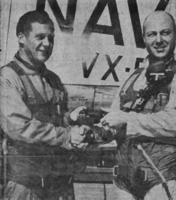 Events October 10, 1956: LCdr. Bennett W. Hooks was killed when he tried to make a forced landing rather than bail out of a burning jet. His A4D-1 Skyhawk (BuNo 139926) exploded and burned on a dry lake yesterday While on a training flight from NOTS China Lake. A Navy spokesman said that moments before he attempted to land LCdr. Hooks shouted over the radio "I'm on fire." Star-News, Thursday, October 11, 1956. LCdr. Bennett W. Hooks VX-5 Project Officer and pilot, was killed when his A4D-1 Skyhawk crashed five miles south of Inyokern at noon last Wednesday. The plane was totally destroyed. China Lake Rocketeer, Friday, October 12, 1956. According to Henry White (VX-5 Feb.1956 - Oct. 1957) it was determined that he was trying to land on the deserted runway at Inyokern during an inflight fire. The autopsy indicated he had inhaled the hot flames and probably died before impact. DEC 1957: VX-5 Christmas Party, Clint Walker entertaining VX-5 dependents, Armitage Field, hangar #1. Photo from C. Gilbert. May 31, 1958: LCdr. Larry Cauble, VX-5, parachuted to safety when his A4D-2 Skyhawk (BuNo 142727) flamed out while executing an over-the-shoulder loft bombing maneuver during the air show NAS Corpus Christi, TX, on Tuesday. A few seconds before the flame out he lofted a simulated A-bomb from an altitude of several thousand feet and dropping it within yards surplus PBM target. Following the flameout he aimed the Skyhawk for the gulf of Mexico, ejected and was rescued by the NAS Corpus Christi rescue helicopter that was hovering nearby. Flown back to the grandstands a dripping wet Cauble was greeted by 150 visiting members of the Aviation Writers Association of America and three Admirals. Rocketeer, Thursday, May 30, 1958. LCdr. Larry Cauble, NOTS China Lake, VX-5, ejected into the Gulf of Mexico when he flamed out during air show demonstration of over-the-shoulder loft bombing maneuver. Only the group around the grandstands including 150 visiting members of the Aviation Writers Association of America and three Admirals knew of his predicament since the majority of the 8,000 spectators were not being informed by the PA system. On hand to greet him after his rescue by the NAS Corpus Christi rescue helicopter were VAdm. Robert Goldwaite, RAdm. Joseph Clifton and RAdm. John T. Hayward. The Bakersfield Californian, Saturday May 31, 1958. After his May 26, 1958 ejection and at the insistence of a flight surgeon - Commander Cauble was flown back to China Lake on a stretcher placed on the flight deck floor ofA3D-2 Skywarrior BuNo. 142250 . April 18, 1961: Lt. Georges E. "Frenchy" LeBlanc, using the NOTS developed RAPEC I seat, ejected safely from his A4D Skyhawk (BuNo 145075) as his engine flamed out at an altitude of 11,000 feet over the Dallas, TX, area Tuesday morning. LeBlanc, Lt. Paul Weitz, and Lt. Charles H . Brown were in flight from NOTS to Cherry Point, NC. He attempted two air starts and ejected at 4,000 feet. After LeBlanc landed in a farm field and signaled he was okay Weitz and Brown headed for NAS Dallas and reported the accident. Rocketeer, USNOTS, China Lake, CA, Friday, April 21, 1961.