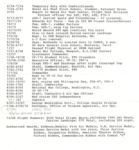 Captain Gray retired on 01JUL70 with 27.5 years of service. He had accumulated 4,550 hours of flight time, which included 1,900 jet hours and 575 carrier landings of which 200 were night traps. He was awarded five Air Medals, the U.N. Service Medal, the Korean Service Medal with two stars, the China Service Medal, the Occupation Ribbon, the American Theater Ribbon, the Victory Ribbon, and the Commendation Ribbon with Combat "V". "Gordo" passed away on December 2, 2007. He was member #77 in the Skyhawk Association.