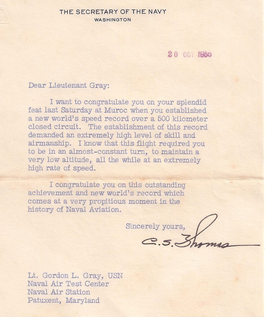 On October 15, 1955, Pax River test pilot, LT Gordon L. "Gordo" Gray, set the world 500 KM closed-course speed record of 695.163 mph while flying A4D-1 Skyhawk, BuNo 137820. The circular course was at Edwards Air Force Base, Muroc CA.