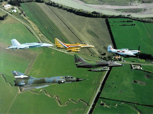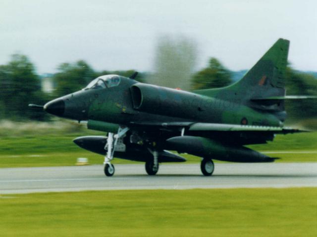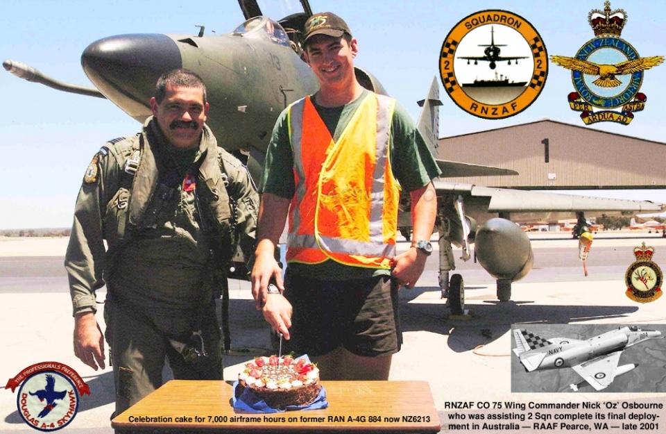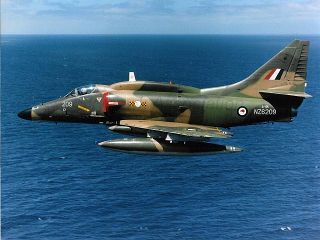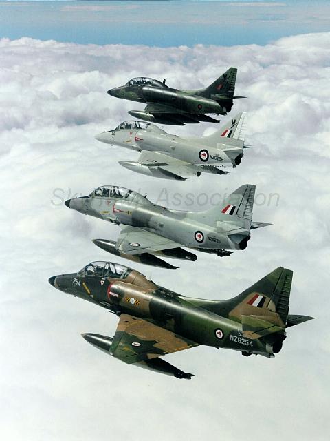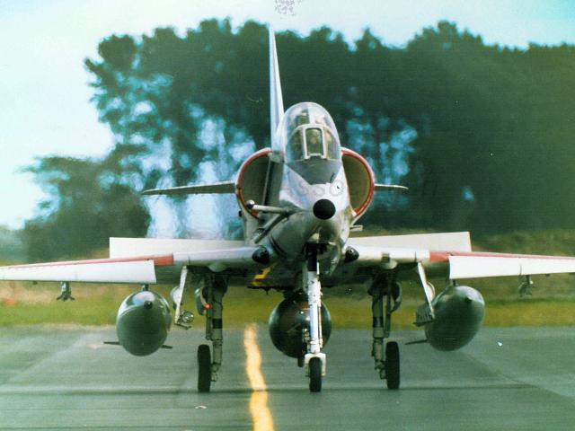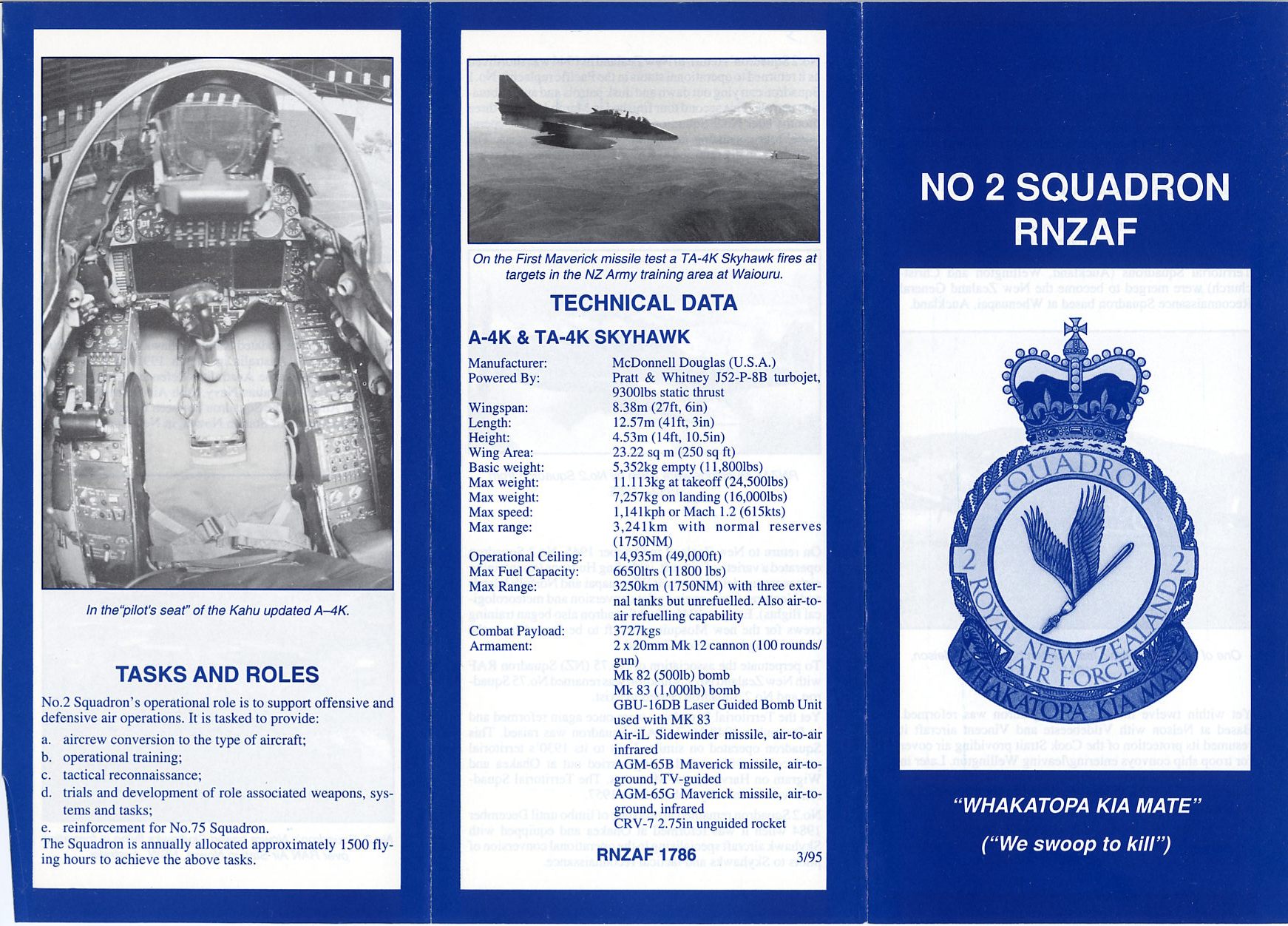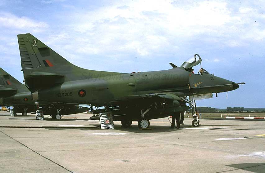 1987: BuNo 154904 NZ6212, 2 Sqn, at Camp Swanson. Don Simms photo. 1987: Unknown TA-4K on the 2 Squadron line at sunset. Glen Turner via Don Simms via Phil Thompson. APR 1987: TA-4K 154912 RNZAF 6256 with her RNZAF 50th Anniversary paint. Pic 1, Pic 2. RNZAF Official Photos, via Don Simms via Phil Thompson. 08 APR 1987: TA-4K 154912 RNZAF 6256 with her RNZAF 50th Anniversary paint, in the lead with two RAN FA-18 Hornets. RNZAF Official Photos, via Don Simms via Phil Thompson. APR 1987:  A very mixed formation for RNZAF 50th Anniversary Airshow of A-4K Skyhawk BuNo 154908, NZ6214, TA-4K BuNo 154912, NZ6256, unknown F/A-18A Hornet, Dassault Mirage IIIO(F), A3-44, and P-51D Mustang NZ2415, 1987 at the RNZAF 50th Anniversary Airshow. 1987: BuNo 157910, NZ-6207, in pre-Kahu configuration carrying dummy weapons. RNZAF Official courtesy of Phil Thompson. 1987:2 Squadron A-4G BuNo 157904 NZ6212 Camp Sanson. By Don Simms. 1987: BuNo 155063 NZ6217 take-off with 500 lb bombs by Don Simms. By Don Simms. 1987: RNZAF 2 Squadron A-4K Skyhawk BuNo 157905 NZ6202, with a MER and 6 bombs on the center-line and what looks like 2.75" FFAR launchers on the wing stations. By Don Simms. Date unknown: BuNo 157905 NZ-6202 parked on the ramp. From Gary Verver Date unknown: BuNo 157908 NZ-6205, parked on the ramp. From Gary Verver. OCT 1988: RNZAF 2 Squadron TA-4K Skyhawk BuNo 157917, NZ6254, Kahu Prototype at Richmond for ABAS, October 1988. From the front to back: 2.75' CRV-7 rockets in 19 shot pods, BDU-44 hi-drag and BDU-33 lo-drag practice bombs on PMBR (6-bomb Practice Multiple Bomb Rack), AIM-9G Sidewinder missile on LAU-7 launcher, AGM-65B Maverick missile, GBU-16 1,000lb laser guided bomb. RNZAF Official. 1988: No. 2 Squadron pilots in front of NZ-6205, BuNo. 157908. RNZAF Official courtesy of Phil Thompson 14 SEP 1989: Coming up short! 14SEP89: TA-4G BuNo 154911, NZ6255 did a wheels-up landing on its drop tanks at Ohakea after tearing off the RH main landing gear touching down short of the runway threshold. Here in a Ohakea hangar, it was repaired and returned to service 12 March 1990. Glen Turner photo, via Don Simms via Phil Thompson 1989: BuNo 154911, NZ6255, in the hangar leaning due to a left wheel in a hole? Or is it just a flat? :) From Don Simms via Phil Thompson. DEC 1989: RNZAF A-4K Skyhawk BuNo 157908, NZ6205, and TA-4K Skyhawk BuNo 157917, NZ6254, and 2 Squadron personnel. Photo RNZAF Official, Don Simms collection, courtesy of Phil Thompson. KIWI RED formation. Courtesy of Gary Verver. KIWI RED A-4ks over Taupo. Courtesy of Gary Verver. The "Kiwi Red" flight demonstration team flying the A-4K Skyhawk lasted just a few years; 1987 to 1990 (?). Pilots were from the 2 and 75 squadrons. 1990s- early: BuNo 155063, NZ6217, over Australia's New South Wales south coast. From Phil Thompson. 25 SEP 1996: No.2 squadron New Zealand Air Force Skyhawk BuNo 154912, NZ6256, in-flight with AIM-9L Sidewinders. RNZAF Photo FEB 1999: BuNo 157915 (52), 154912 (56), 157914 (51), 155052 (15), 155063 (17) are the first five. Shots showing 15 Skyhawks at Nowra (RAN base in Australia that 2 Sqn was based at in 1999. It was a combined 2 and 75 Sqn Fleet Concentration Period (FCP) exercise with the RAN and RNZAF. All 15 jets flew a maritime strike on the day this photo was taken. 100 percent serviceability! FEB 1991: BuNo 155069, NZ6218, and BuNo 157908, NZ6205, over RANAS Nowra (RAN air station Albatross). No.2 Squadron moved to Nowra, NSW, Australia, in FEB 1991 where it provided training for the RAN and conversion of RNZAF Skyhawk pilots. The squadron was equipped with two A-4K and four TA-4K aircraft supported by 50-60 personnel. No.2 Squadron continued to provide air defence training to the Australian Defence Force until NOV 2001. Photo from Phil Thompson. 1992: BuNo 157908, RNZAF NZ-6205. RNZAF Official courtesy of Phil Thompson. 1992: BuNo 157908, RNZAF NZ-6205. RNZAF Official courtesy of Phil Thompson Manning up TA-4K 251, BuNo 157914. 1999: Number 75 And Number 2 Squadrons Diamond A combined effort of RNZAF Skyhawk Squadrons 2 and 75 during a 1999 Fleet Concentration Period at Nowra. 75 Squadron deployed nine Skyhawks to Nowra to meet up with 2 Squadron's six Scooters. All fifteen RNZAF Skyhawks fly past in a trim Diamond. Photograph by Don Simms FEB99: Deployment Flight Line - Feburary 1999 RNZAF Number 2 and Number 75 Squadron's Skyahwk aircraft are shown on the Darwin, Australia tarmac during a major Navy exercise. Photograph by Don Simms 2001: No. 2 Sqn celebrates 7,000 hrs. by BuNo 154905. Y2000: NZ-6205 peels away from the photographer. RNZAF Official courtesy of Phil Thompson. A-4K pulls in behind. Courtesy of Gary Verver. Former A-4G with RAN as "876", transferred JUL 1984. Courtesy of Gary Verver. 09 NOV 2001: RNZAF Cpl. Corrie Everest sporting a fly stopping Aussie cork hat, RNZAF 2 Squadron Last Exercise, RAAF Pearce, 09 November 2001. 12 NOV 2001: RNZAF 75 Sqn. Flt. Lt. Darren Smith and 2 Sqn. Fg. Off. Kelly Logue relax between sorties, RNZAF 2 Squadron Last Exercise, RAAF Pearce, 12 November 2001. 14 NOV 2001: RNZAF Shift One briefing, RNZAF 2 Squadron Last Exercise, RAAF Pearce, 14 November 2001. 09 NOV 2001: RNZAF Cpl. Paul Blondell fixing a light on an unknown 75 Sqn. A-4K Skyhawk, RNZAF 2 Squadron Last Exercise, RAAF Pearce, 09 November 2001. 08 NOV 2001: RNZAF 75 Squadron pilot Flt. Lt. Darren Smith and 2 Squadron Fg. Off. Kelly Louge signing out their A/C with Sgt. Glen Turner, RNZAF 2 Squadron Last Exercise, RAAF Pearce, 08 November 2001. 09 NOV 2001: RNZAF Sgt. Jay McIntyre sorting through A/C paperwork, RNZAF 2 Squadron Last Exercise, RAAF Pearce, 09 November 2001. 08 NOV 2001: RNZAF 75 Squadron CO Wg. Cdr. Nick Osborne signing out his aircraft, RNZAF 2 Squadron Last Exercise, RAAF Pearce, 08 November 2001. 07 NOV 2001:Base Commander (RAAF Pearce) Group Captain Johnston meets RNZAF 2 Sqn. CO Sqn. Ldr. Jason Easthope, Last Exercise, RAAF Pearce, 07 November 2001. 07 NOV 2001: Base Commander