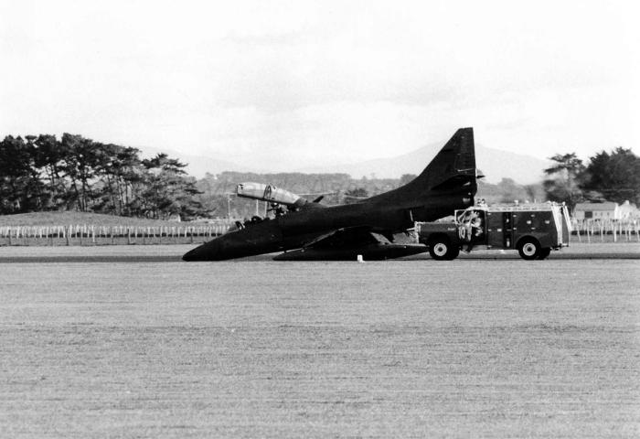 1986: right front cockpit close-up of RNZAF 2 Squadron TA-4K Skyhawk BuNo 157914, NZ6251, in-flight over the sea. RNZAF Official, Don Simms collection. 1986: A-4G 155052 NZ6215 taxi silver bucket. 1986: A-4G 155061 NZ6216 on the line at Ohakea. 1988: Left side view of RNZAF 2 squadron TA-4K Skyhawk BuNo 157917, NZ6254, on the ramp next to British Aerospace Bae 146-100 s/n G-BSTA. Unknown Photographer via W. Mutza 1988: The RNZAF "Kiwi Reds" demonstration team over Australia's Sydney Harbour. Photo from Phillip Thompson, former RAN FAA Skyhawk Pilot. Date unknown: BuNo 157904 (a 2 Sqn jet at the time) flying past a RAN FFG 01 (HMAS Adelaide) during a joint maritime strike exercises with the RAN. RNZAF Official Photo from Don Simms via Phil Thompson. 1986: A-4G 155061 NZ6216, A-4G 154904 NZ6212 & unknown A-4K formation take-off. The two A-4G aircraft are former RAN 874 and 883. A-4G 154904 NZ6212 back on deck after an in-flight loss of the canopy. From Don Simms via Phil Thompson. 1986: left front view of RNZAF 75 Squadron A-4K Skyhawk BuNo 157907, NZ6204, in the background as 2 Squadron ground crew bid farewell to 2 pilots. Don Simms collection, courtesy of Phil Thompson. 1986: A-4G 154904 NZ6212 in the 2 Squadron hangar in bare metal finish. 1986: 154912 TA-4G NZ6256 when she was still in RAN (TA-4G) colors and before conversion to TA-4K configuration. DEC 1986: BuNo 154912, former RAN -TA-4G, partially coverted (no squared off tail yet for IFF Ant.) to a TA-4K. She is in a "test" paint scheme prior to a final paint job for the RNZAF 50th Anniversary. Next photos will show a "trial" stripes configuration. DEC 1986: Pic1, 2 Squadron TA-4G 154912 RNZAF 6256 being prepared for repainting for the 50th anniversary of the RNZAF. Note the paint "comments" before starting on the next effort. Pic2, 2 Squadron TA-4G 154912 RNZAF 6256 being prepared for repainting for the 50th anniversary of the RNZAF. Pic3, 2 Squadron TA-4G 154912 RNZAF 6256 being painted with stripes for the 50th anniversary of the RNZAF. Pic4. 2 Squadron TA-4G 154912 RNZAF 6256 being painted with stripes for the 50th anniversary of the RNZAF. Pic5, 2 Squadron TA-4G 154912 RNZAF 6256 with new stripes for the 50th anniversary of the RNZAF.