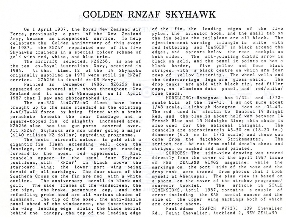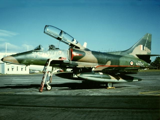 Unit Photos 1978: 157908 NZ6205 NZ6204 refueling from USMC VMGR-152 KC-130F Hercules tanker BuNo 148247, QD-247, prior to deploying for Exercise RIMPAC, 1978. Photographer unknown, courtesy of Phil Thompson. 1985: A-4K 157912 NZ6209 in flight. From Don Simms via Phil Thompson. 1985: A-4K 157913 NZ6210 over Wellington. From Don Simms via Phil Thompson. 1985: TA-4K 157915 NZ6252 by 2 Squadron hangar. From Don Simms via Phil Thompson. Royal New Zealand Air Force #2 squadron Skyhawk BuNo 157917, NZ-6254, parked on the Ohakea ramp. Les Marriage 1985: TA-4G 154911 NZ6255 on the 75 Squadron line. Wemaster's guess is it is next to A-4G 155061 NZ6216. Glen Turner photo via Don Simms via Phil Thompson. 1985: A-4G 155052 NZ6215 taxiing at Ohakea. From Glen Turner. 19 MAR 1986: Royal New Zealand Air Force 2 squadron Skyhawk BuNo 157917, NZ-6254, as she taxis by the photographer. R.A. London 1986: right front view of RNZAF 2 Squadron A-4K Skyhawk BuNo 157912, NZ6209, in the hangar at Ohakea. Photo Glen Turner, Don Simms collection, courtesy of Phil Thompson. 1986: 2 Squadron Skyhawk flight line at Ohakea, l-r A-4K BuNo 157913, NZ6210, A-4G BuNo154905, NZ6213, A-4K BuNo 157907, NZ6204 & TA-4G BuNo 154912 NZ6256, 1986. Photo Glen Turner, Don Simms collection, courtesy of Phil Thompson. 1986: right rear view of RNZAF 2 Squadron A-4K Skyhawk BuNo 157913, NZ6210, on the line next to an unknown A-4G Skyhawk in its original RAN colours at Ohakea. Photo Glen Turner, Don Simms collection, courtesy of Phil Thompson. 1986: 2 Squadron Skyhawk flight line at Ohakea, l-r A-4K BuNo 157913, NZ6210, A-4G BuNo154905, NZ6213, A-4K BuNo 157907, NZ6204 & TA-4G BuNo 154912 NZ6256, 1986. Photo Glen Turner, Don Simms collection, courtesy of Phil Thompson. 1986: right rear view of RNZAF 2 Squadron A-4K Skyhawk BuNo 157913, NZ6210, on the line next to an unknown A-4G Skyhawk in its original RAN colours at Ohakea. Photo Glen Turner, Don Simms collection, courtesy of Phil Thompson. 1986: right rear view of RNZAF 2 Squadron flight line, l-r A-4K Skyhawk BuNo 157913, NZ6210, TA-4G BuNo 154912, NZ6256, A-4K BuNo 157907, NZ6204, A-4G BuNo 154905, NZ6213 and A-4K BuNo 157913, NZ6210, in mixed colour schemes at Ohakea. Photo Glen Turner, Don Simms collection, courtesy of Phil Thompson. 1986: right front cockpit close-up of RNZAF 2 Squadron TA-4K Skyhawk BuNo 157914, NZ6251, in-flight over the sea. RNZAF Official, Don Simms collection. /157913-a-4k-ddmmm86-rnzaf-nz6210-mixed-colour-schemes-2-sqn-line-ohakea-glen-turner-photo.jpg">right rear view of RNZAF 2 Squadron flight line, l-r A-4K Skyhawk BuNo 157913, NZ6210, TA-4G BuNo 154912, NZ6256, A-4K BuNo 157907, NZ6204, A-4G BuNo 154905, NZ6213 and A-4K BuNo 157913, NZ6210, in mixed colour schemes at Ohakea. Photo Glen Turner, Don Simms collection, courtesy of Phil Thompson.