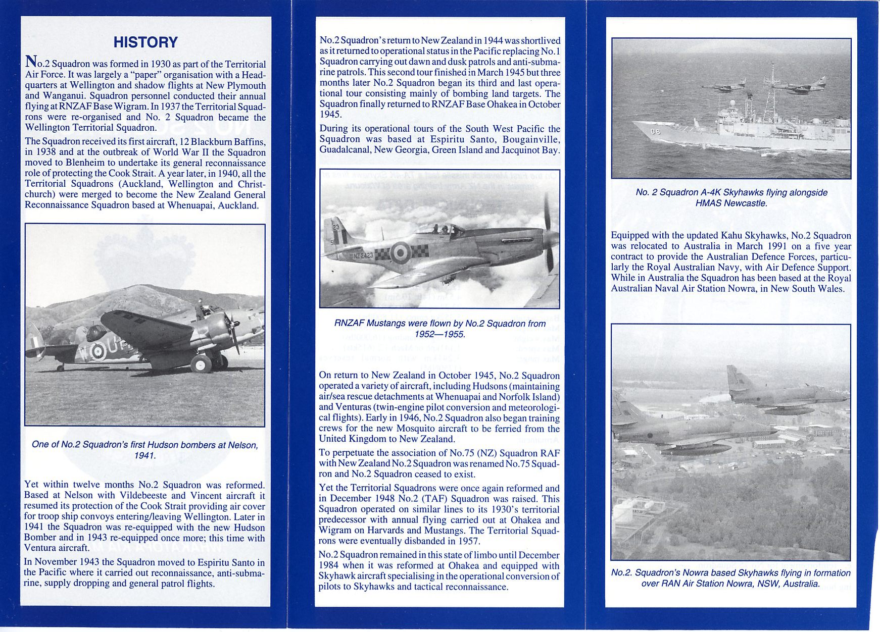 1930: Established as part of the "Territorial Air Force". 1940: "Territorial Squadrons" merged into "NZ General Reconnaissance Squadron. 1941: No. 2 Squadron reformed. OCT 1946: dis-established and assets used to form RNZAF 75 Squadron. 1948-57: existed again as a New Zealand "Territorial Squadron". DEC 1984: New No 2 Squadron established, flying the Skyhawk. JAN 2002: terminated operations.  |