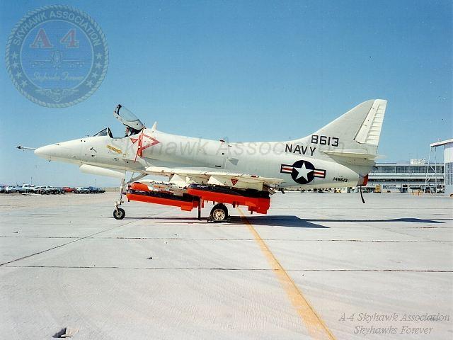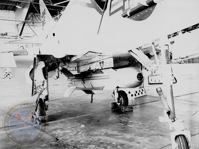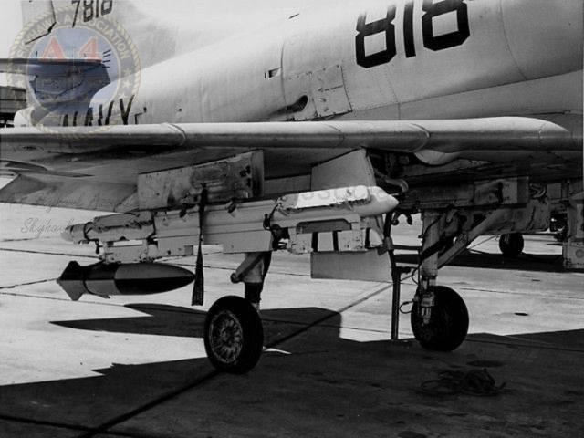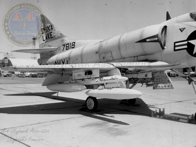 01MAR62: China Lake Skyhawk BuNo 137818 on the ramp with a GLADEYE dispenser on the centerline. Pic2. Navy Photos.