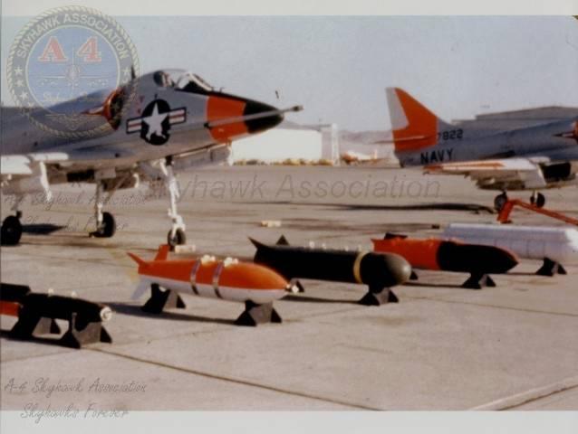 17MAY63: NA-4C 145063 and YA-4A 137822 behind the display of free-fall ordnance: l-r Snakeye, Sadeye, Rockeye, Padeye, Gladeye. Navy photo.