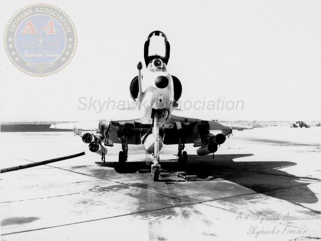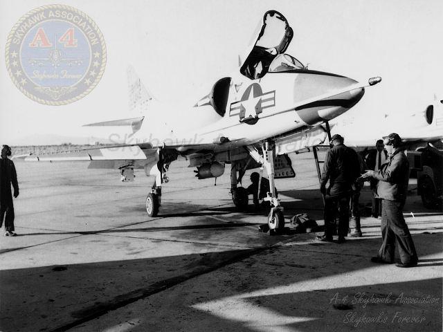 MAR79: China Lake Skyhawk BuNo 152101 parked on the hot line. Photo by P. Minert via Tailhook Association.