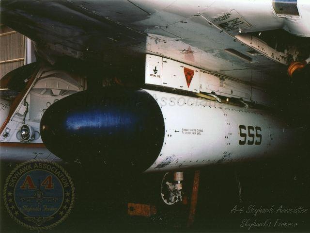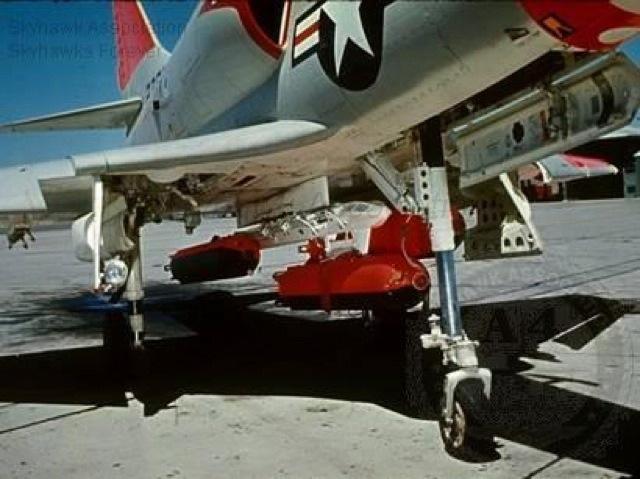 12JUN62: China Lake Skyhawk BuNo 137818 close-up of the GLADEYE chaff, leaflets or antipersonnel ordnance dispenser on the centerline station. China Lake Skyhawk BuNo 137818 close-up of the GLADEYE chaff, leaflets or antipersonnel ordnance dispenser on the centerline station. Unknown photographer from R. Summers collection.