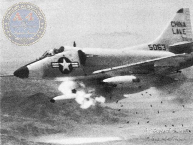 SEP63: A-4C Skyhawk BuNo 145063 with three HIPEG 20mm under-wing gun pods strafing a tank target, China Lake. Naval Aviation News photo.