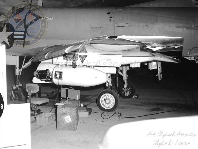 02OCT78: Close-up left front view of China Lake Skyhawk BuNo 153677 parked in hangar #3 with a SSS pod on the center line. Closer close-up. Official U.S. Navy photo, G. Verver collection.