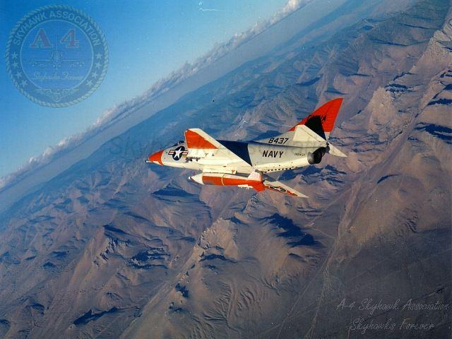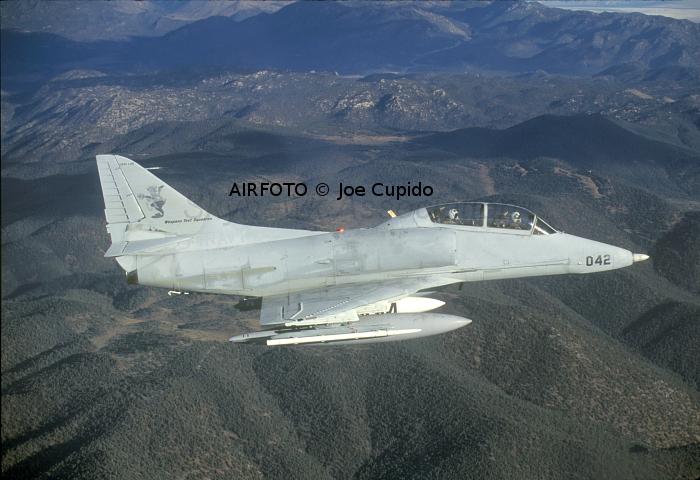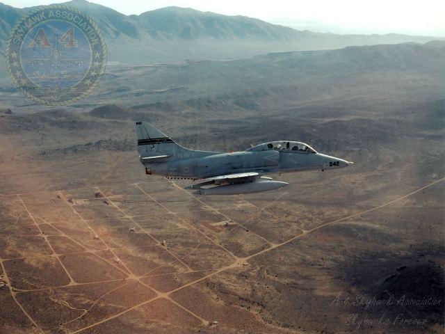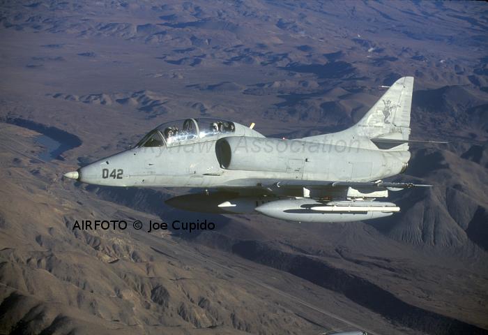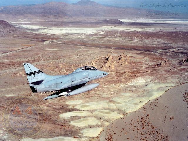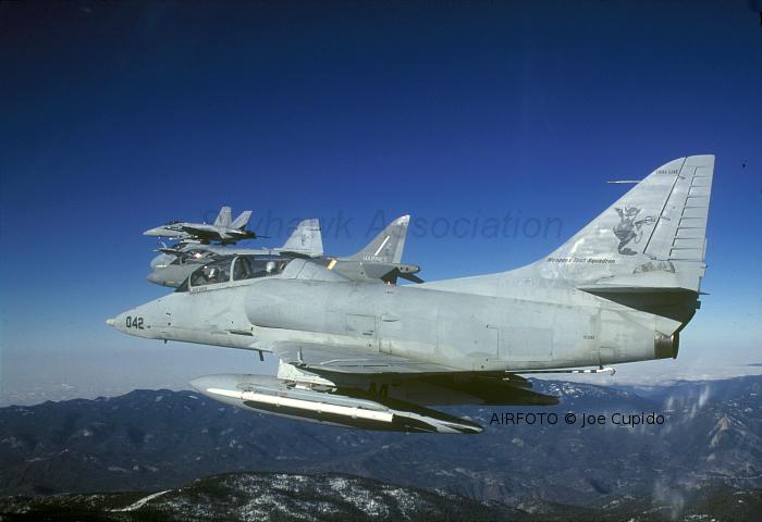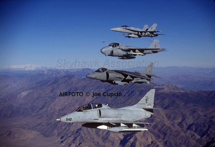 DEC 1995 NWC China Lake: TA-4F Skyhawk BuNo 152102 (042) in flight over the Sierras with AV-8B Harrier BuNo 163854 (85), A-6E Intruder 155698 (608) and F/A-18C Hornet BuNo 163429 (108). Pic1, Pic2, Pic3, Pic4 TA-4F Skyhawk BuNo 152102 (042) in flight over the Sierras with AV-8B Harrier BuNo 163854 (85), A-6E Intruder 155698 (608) and F/A-18C Hornet BuNo 163429 (108). Another shot.
