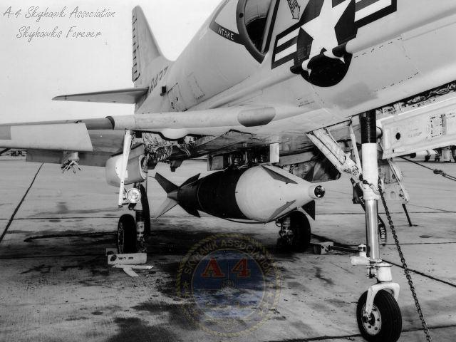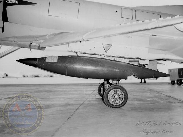 07NOV61: A4D-1 137814 on the ramp at NAF China Lake with the Weteye chemical bomb on the centerline station. Closeup. Navy photo.