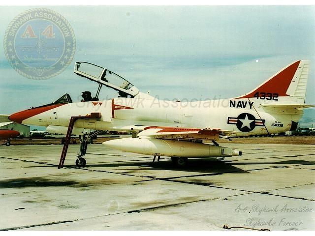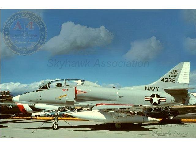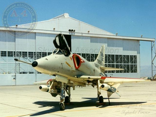 APR84: Left front view of China Lake Skyhawk BuNo 154332, parked on the ramp west of hangar #3. Photo by J. Jacobs via Tailhook Association.