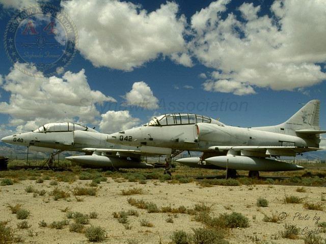 MAY 1998: NAWS 152012 and 154332 (040) at the aircraft compound on the south side of the China Lake airfield. Pic2 TA-4F BuNo 152102, #042, and TA-4F BuNo 154332, #040, at rest in the China Lake Museum's aircraft compound awaiting restoration. AIRFOTO © Joe Cupido.