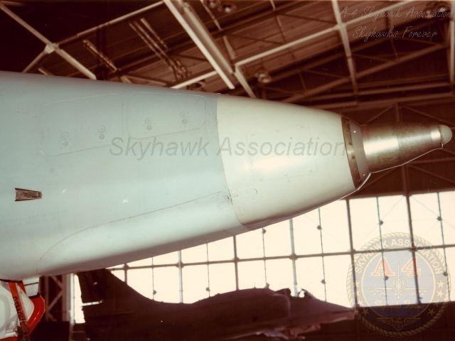 NOV83: left front view of China Lake Skyhawk BuNo 152848 with HARM seeker nose parked on the ramp. Photo by J. Jacobs via Tailhook Association.