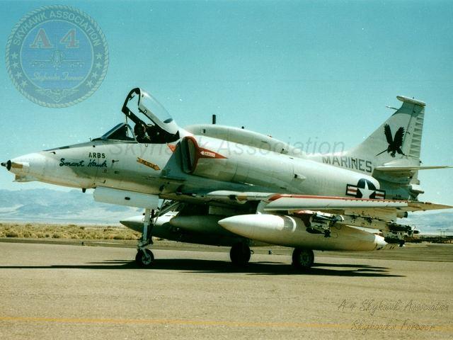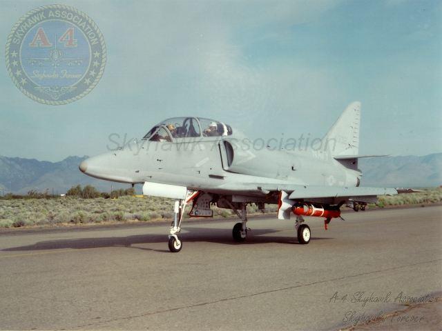 JUN80: Right front view of China Lake Skyhawk BuNo 160245, with AGM-65E Maverick missiles. Pilot is USMC MAJ John Bland. Photo via LCDR Rick Burgess, USN Retd.
