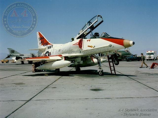 1983: Right side view of China Lake Skyhawk BuNo 160245 parked on the Hot Line. Photo by C.T. Robbins, G. Verver collection.