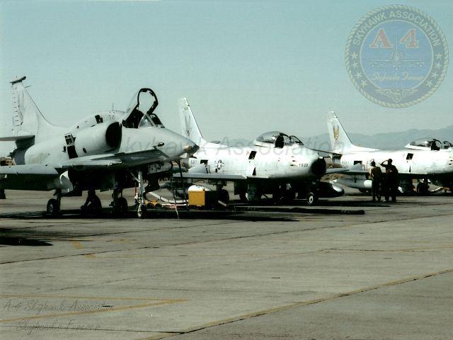 08NOV79: China Lake Skyhawk BuNo 152101, Top Gun BuNo 150044, #555, China Lake BuNo 154172 China Lake BuNo 153677 parked on the Hot Line. Navy photo.