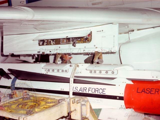 Right side close-up view of a USAF laser guided Maverick missile being loaded on China Lake Skyhawk BuNo 160264, #2960 at NWC China Lake. 2nd right side close-up view of a USAF laser guided Maverick missile being loaded on China Lake Skyhawk BuNo 160264, #2960 at NWC China Lake. Front close-up view of a USAF laser guided Maverick missile being loaded on China Lake Skyhawk BuNo 160264, #2960 at NWC China Lake. Head-on close-up view of a USAF laser guided Maverick missile being loaded on China Lake BuNo 160264, #2960. Navy photos from Gary Verver.