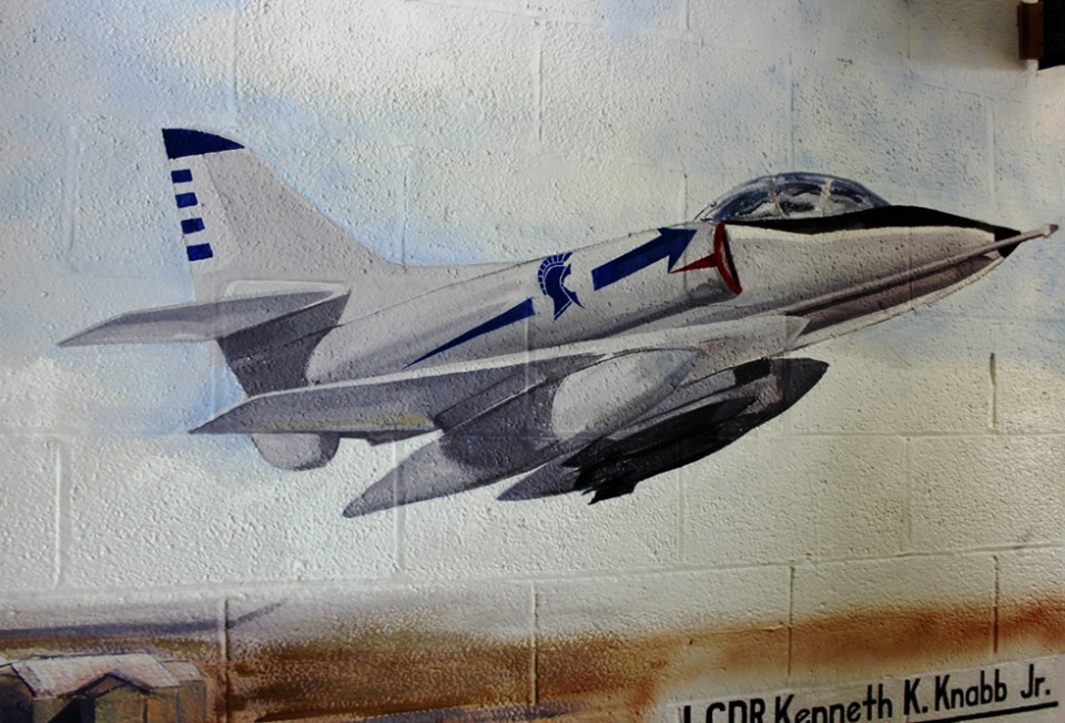 Photos 11 April 2014: The VFA-106 FA-18 Replacement Air Group (RAG), has painted this VA-106 Gladiators A-4 Skyhawk on a bulkhead just outside their ready room at NAS Oceana. Photo from Dave Dollarhide. 11 April 2014: Members of the A-4 Skyhawk Association stand in front of VC-12 Omars A-4E Skyhawk BuNo 150036 static display with the VFA-106 and NAS Oceana COs who are wearing the flight suits. Others standing left to right are Bob Powell, Steve Linder, Gene Atwell, Todd Frommelt, Standing from left Dave Dollarhide, Mark Williams, Pete Cole, Bill Ravgila, Joan and George Blosser. Photo from Dave Dollarhide. Off-Duty Photos No info yet. |