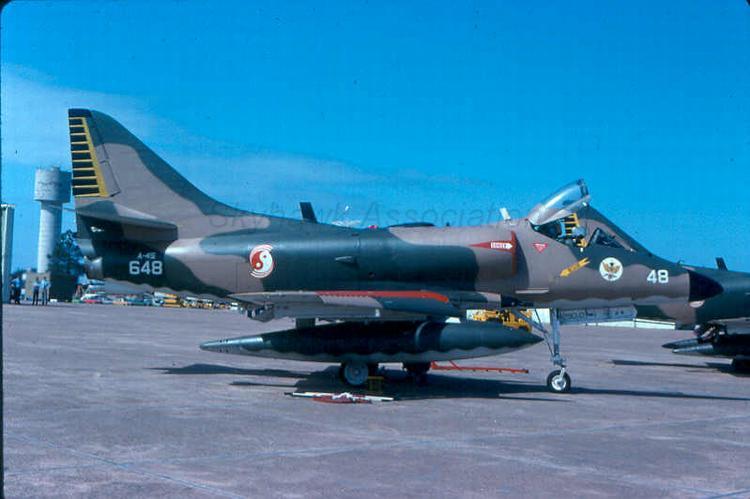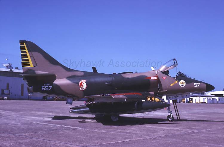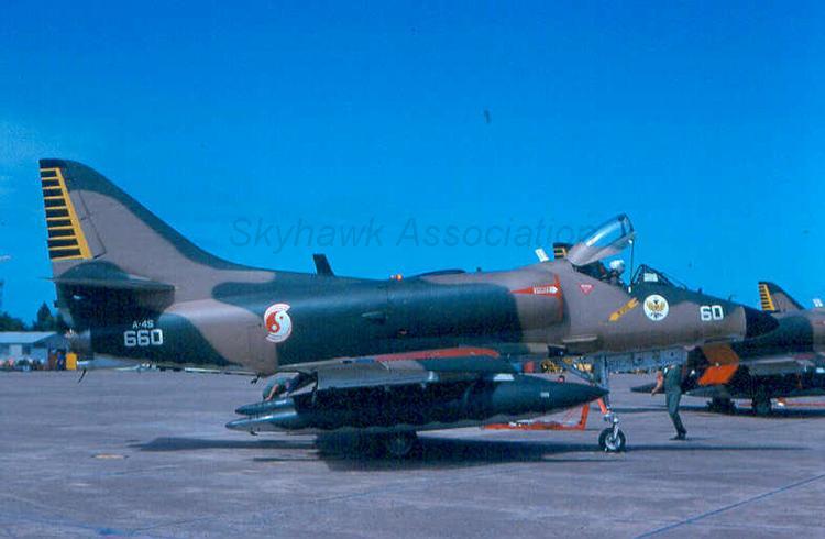 Events 1972: RSAF begins its purchase of A-4B Skyhawks. 1973: Two Skyhawk squadrons are formed, 142 Squadron, the Gryphon, at Tengah AB; and 143 Squadron, the Phoenix, at Changi AB. 1974: When I was a flight instuctor in VT-24 (Chase Field, Beeville, Texas) in 1974 we had 5-6 students from the Singapore AF going through transition training. I had the CO, Gary Yeo, as one of my students. They showed me pictures of the single- and two-seat A-4s waiting for them back home. "Dwarf" 1980s:The 143 squadron was first to fly the upgraded A-4SU Skyhawk. 2003: The A-4SU Skyhawk is retired and replaced with the F-16 Fighting Falcon. ents