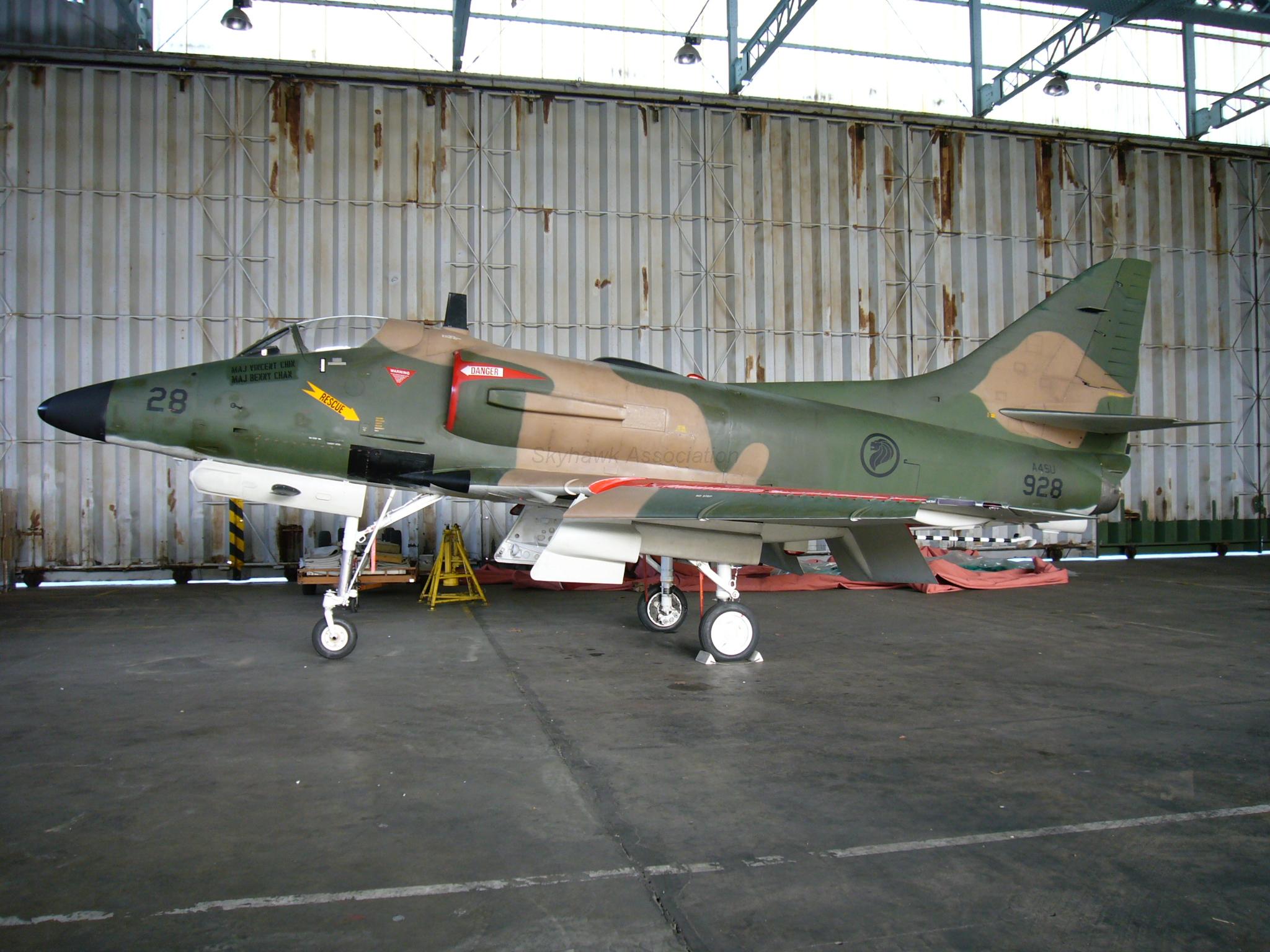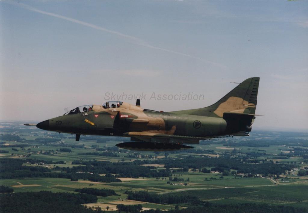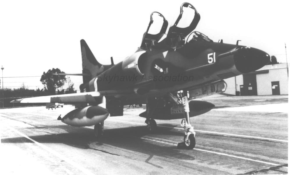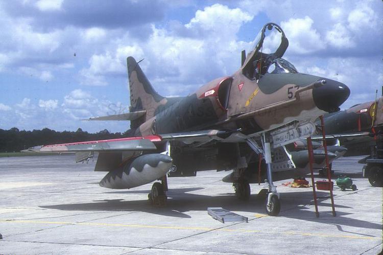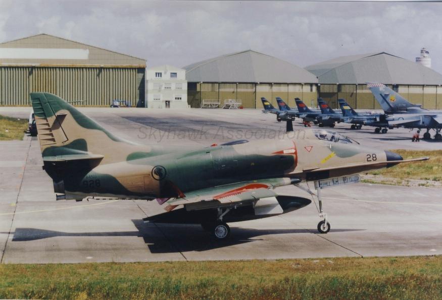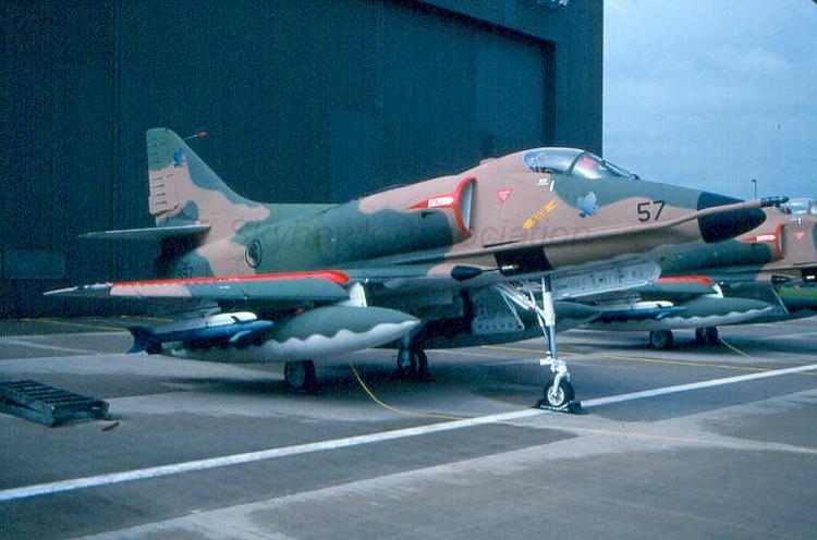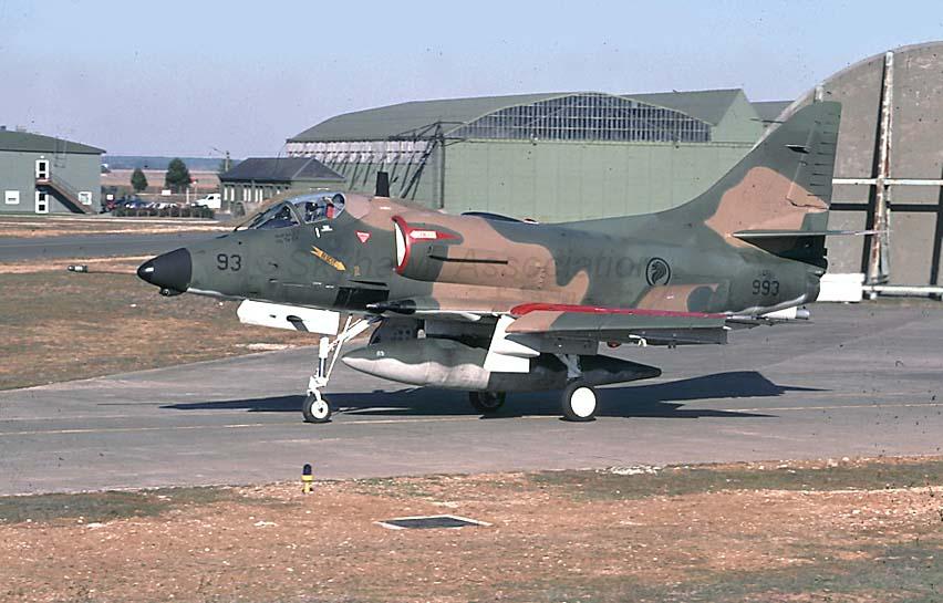 Events 1972: RSAF begins its purchase of A-4B Skyhawks. 1973: Two Skyhawk squadrons are formed, 142 Squadron, the Gryphon, at Tengah AB; and 143 Squadron, the Phoenix, at Changi AB. 1974: When I was a flight instuctor in VT-24 (Chase Field, Beeville, Texas) in 1974 we had 5-6 students from the Singapore AF going through transition training. I had the CO, Gary Yeo, as one of my students. They showed me pictures of the single- and two-seat A-4s waiting for them back home. 1997: In 1998, the RSAF decided to base a detachment of Super Skyhawks overseas for its advanced pilot training program. An agreement was reached with the French government for hosting the RSAF training at Cazaux AB in the south of France. Since then, about 18 Skyhawks call Cazaux home. In 1997 the 143 Sqn was dis-established and its aircraft were re-assigned to the 150 Sqn. The 150 had previously flown the SIAI-Marchetti SF.260. With its new aircraft, the 150 was assigned the role of advanced jet training and thus became the unit to deploy to France. 23 JUN 2005: Sighted in France during air show at Cazaux AB, France: In the hangar: 902 148483 Static display: 950 145033 Flightline: 905 148529 Y2012: Estimation for 150 Squadron flying in France as an advanced training squadron utilizing Skyhawks is 4 A-4SU and 7 TA-4SU aircraft. |