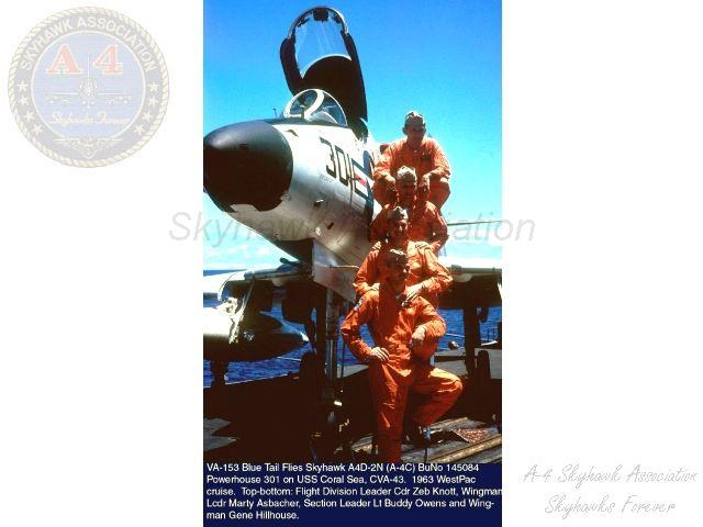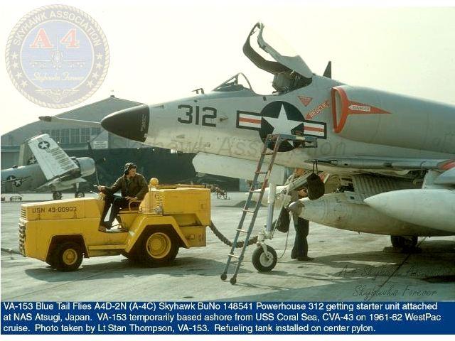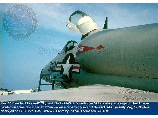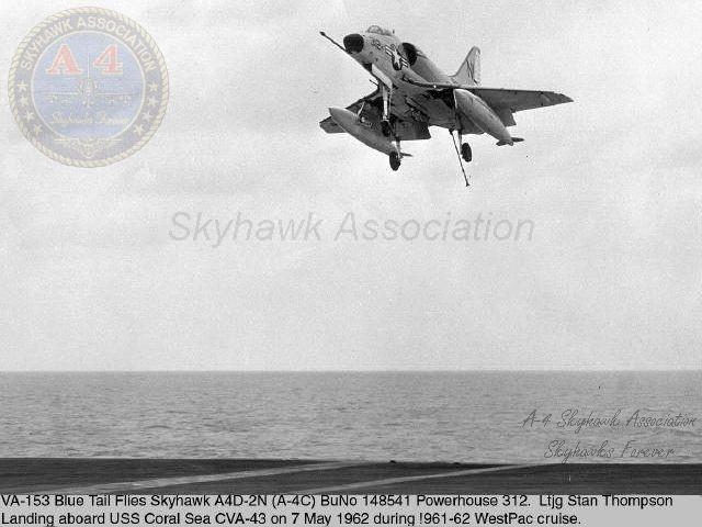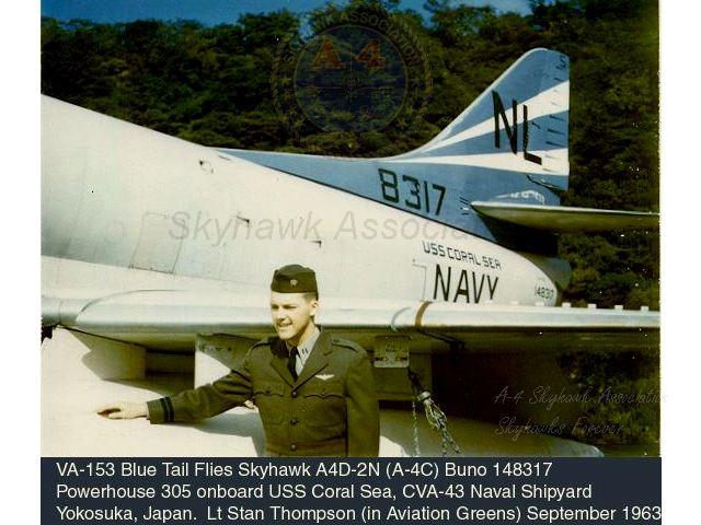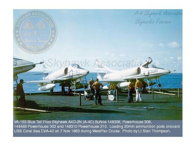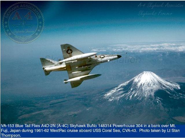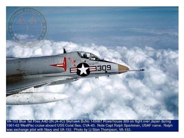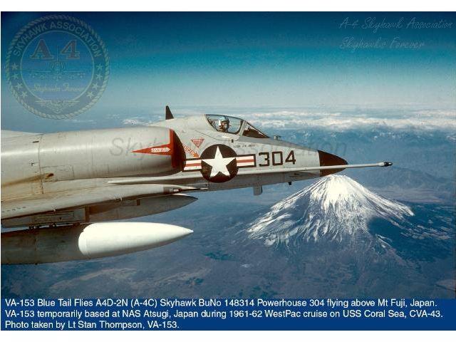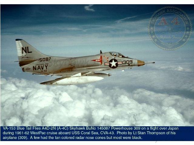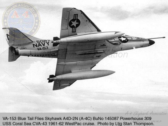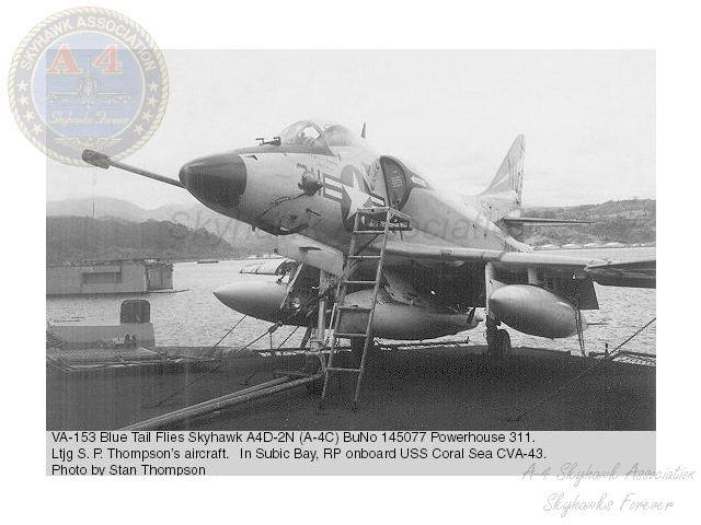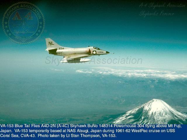 Unit Photos JUL59: NAN photo of Marines working on a J-65 engine. JUL59 NAN. U.S.S. Hancock Feb. 1958 - Jan. 1960: VA-153 Blue Tail Fly A4D-1 BuNo. 142156, side number NL 303, attached to CVG-15, is ready to go on the catapult (probably on the United States Ship Hancock CV 19). USN photograph from Douglas Aircraft Company files and provided by Harry S. Gann. 1960 U.S.S. Hancock: Blue Tail Flies Skyhawk NL-301 forms the backdrop for five pilots (CDR Jack Bauman, LCDR Ralph Odgers, LT's Jim Doolittle, Tom Brown & Ben Fromm) who became Centurions during the Westpac deployment. Naval Aviation News photo. 1960-61: Blue Tail Flies Skyhawk BuNo 142923 undergoing maintenance in the hangar. Douglas. U.S.S. Coral Sea SEP 1960: A-4C BuNo. 147825, side number NL 302, attached to CAW-15 aboard the United States Ship Coral Sea CVA-43 -- is pictured on the Naval Air Station Lemoore ramp. Blue Tail Fly A-4F BuNo. 155026, side number NL 306, attached to CAW-15 aboard the United States Ship Coral Sea CVA-43 -- is pictured on the Naval Air Station Lemoore ramp. Photograph by Harry S. Gann. 1961-62: A4D-2N Skyhawk BuNo 148307 Powerhouse 307, NL-307, USS Coral Sea, CVA-43, during the 1961-62 WestPac cruise. Front row Ens. H.J. Ferris, Lt. D.H. Westbrock, LCdr. R.R. Wilson, Lt. D.D. Owens, Ltjg A.J. Salkovics, LCdr. D.L. Johnson, Ltjg G.H. Hillhouse, Ltjg S.P. Thompson and Capt. (USAF) R.R. Sparkman. Second row: Ltjg R.A. Stromberg, Lt. W.O. Bennett, Lt. J.F. McCarthy, LCdr. J.E. Russ, Cdr. J.F. Kirklighter, Cdr. W.C. May, Cdr. W.R. Horner, Lt. R.P. Klugh, Ltjg G.W. Woehrmann, Ltjg M.A. McCarthy, Ltjg L.E. Printup and Ltjg F.O. Caron. 1961-1962 A4D-2N BuNo147844, Powerhouse 300, NL-300, aboard the USS Coral Sea, CVA-43, as Lt. Salkovics does a pre-flight. Photo by Stan Thompson. 1961-62: BuNo.145077 being manned by LTJG Stan Thompson aboard CVA-43, USS Coral Sea during the 1961-62 WestPac cruise. Photo by Stan Thompson. 1961-62: A4D-2N Skyhawk BuNo.148498 Powerhouse 313, NL-313, and VA-155 Silver Foxes A4D-2 BuNo 142849, NL-606, aboard the USS Coral Sea, CVA-43, opposite VF-154 F8U-2N Crusaders BuNo 147908, NL-406, and BuNo 148659, NL-409, and VF-151 Vigilantes F3H-2 Demon BuNo 146734, NL-102, 1961-62. Photo by Stan Thompson.. 1961-62: A4D-2N Skyhawk BuNo 145087, NL-309, inflight over Japan during the 1961-62 USS Coral Sea, CVA-43, WestPac cruise. Photo by Stan Thompson. 1961-62: A4D-2N Skyhawk BuNo 145087 ...Lt. Stan Thompson's VA-153 Blue Tail Flies A4D-2N Skyhawk BuNo 145087 Powerhouse 309, NL-309, inflight during the 1961-1962 Westpac cruise. Photo by Stan Thompson. 1961-62: A4D-2N Skyhawk BuNo 145087 Powerhouse 309, NL-309, inflight over Japan during the 1961-62 USS Coral Sea, CVA-43, WestPac cruise. Photo by Stan Thompson. 1961-62: A4D-2N Skyhawk BuNo 145087, Powerhouse 309, NL-309, inflight over Japan during the 1961-62 USS Coral Sea, CVA-43, WestPac cruise. Note exchange pilot USAF Capt. Ralph Sparkman's name beneath the canopy. Photo by Stan Thompson. 1961-62: BuNo.148307 as the pilot tries to uncock the nosewheel aboard the USS Coral Sea, CVA-43during the 1961-62 WestPac cruise. Photo by Stan Thompson. 1961-62: BuNo.148308 aboard CVA-43, USS Coral Sea during the 1961-62 WestPac cruise. Photo by Stan Thompson. 1961-62: A4D-2N Skyhawks BuNo.145087, NL-309, and BuNo 147825, NL-302, in formation over Japan during the 1961-62 USS Coral Sea, CVA-43, WestPac cruise. Photo by Stan Thompson. 1961-62: A4D-2N Skyhawk BuNo 148314, NL-304, flying above Mt. Fuji while temporarily based at NAS Atsugi, 1961-62. Photo by Stan Thompson. 1961-62: A4D-2N Skyhawk BuNo 148314, NL-304, in a bank over Mt. Fuji while temporarily based at NAS Atsugi, 1961-62. Photo by Stan Thompson. 1961-62: A4D-2N Skyhawk BuNo 148314, NL-304, flying over Mt. Fuji while temporarily based at NAS Atsugi. Photo by Stan Thompson. 1961-62: A4D-2N Skyhawk BuNo 148541 Powerhouse 312, NL-312, tanker getting the starter unit (huffer) attached at NAS Atsugi, Japan while the Blue Tail Flies were temporarily based ashore during the 1961-62 WestPac cruise. Photo from Stan Thompson. 07 May 1962: A4D-2N Skyhawk BuNo 148541, Powerhouse 312, NL-312, Lt(jg) Stan Thompson, coming aboard the USS Coral Sea, CVA-43, during the 1961-62 WestPac cruise. Photo from Stan Thompson. BuNo.145077 at Subic aboard CVA-43, USS Coral. Photo by Stan Thompson. 1963-65: Naval Air Station Lemoore ramp. A row of parked VA-153 A-4E Skyhawks at Naval Air Station Lemoore. From front right to rear left: BuNo. 147718 side number NL 313; BuNo. 148481; BuNo. 148310; BuNo. 149573; BuNo. 148306. Photograph by Harry S. Gann. BuNo.147825 at NAS Lemoore. Photo by Stan Thompson. 1961-62: A4D-2N Skyhawk BuNo 147825 Powerhouse 302, NL-302, inflight over Japan during the 1961-62 USS Coral Sea, CVA-43, WestPac cruise. Photo by Stan Thompson. 1961-62: Coral Sea: BuNo.147825 traps aboard CVA-43, USS Coral. Photo from Stan Thompson. LT Stan Thompson poses next to a Crusader. Photo by Stan Thompson. April 1962 CDR Kirklighter's Farewell. Photos from Stan Thompson. LTJG Hakanson, a "Demon" Driver. Photo by Stan Thompson. LT Owens and LT Thompson at NAS Atsugi. Photo by Stan Thompson. LTJG Printup aboard the Coral Sea. Photo by Stan Thompson. 1961-62 CVA-43: LCDR Jack Russ aboard the Coral Sea. Photo by Stan Thompson. Drawing illustrating the tanking role of the Skyhawk. Photo by Stan Thompson. LT Westbrock and LT Owens prepare for a flight. Photo by Stan Thompson. Stan Thompson VA-153 photo gallery for 1961-63 cruises. Photos by Stan Thompson. Thompson Sasebo Yen exchange. SDO: Thompson VA-153 SDO. Thompson CVA-43. Thompson CVA-43. CVA-43: Thompson CVA-43. CVA-43: Thompson 4. CVA-43: Thompson CVA-43 5. CVA-43: Thompson CVA-43 6. CVA-43: Thompson CVA-43 7. CVA-43: Thompson CVA-43 8. CVA-43: Thompson CVA-43 9. CVA-43: Thompson CVA-43 10. CVA-43: Thompson CVA-43 11. CVA-43: Thompson CVA-43 12. CVA-43: Thompson CVA-43 13. CVA-43: Thompson CVA-43 14. CVA43: Thompson CVA-43 15. CVA-43: Thompson CVA-43 16. CV