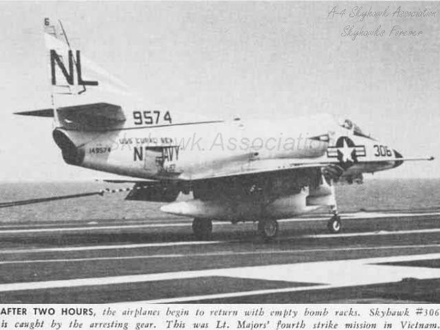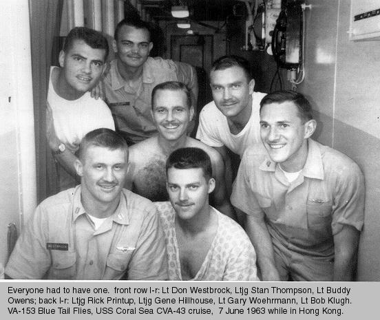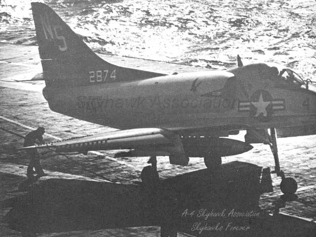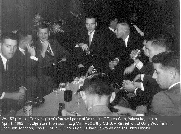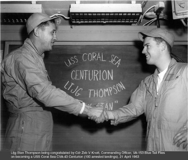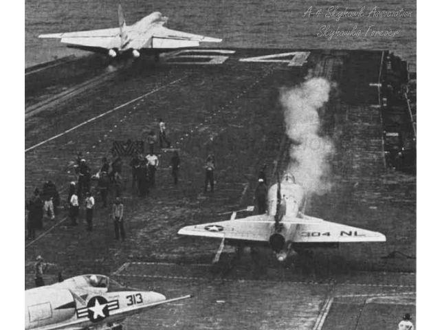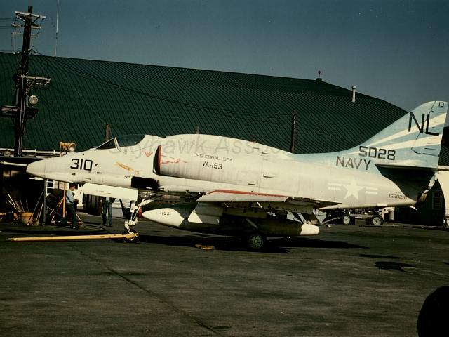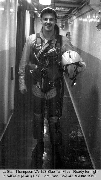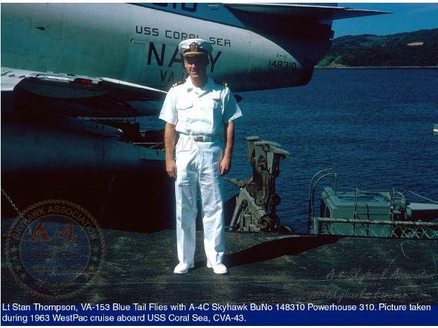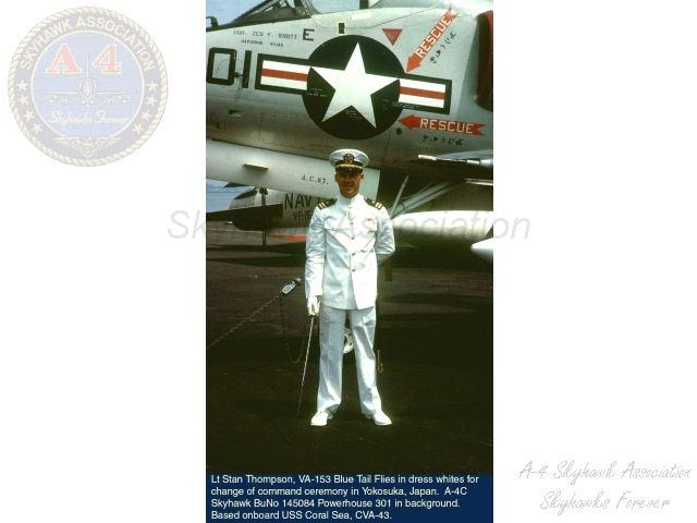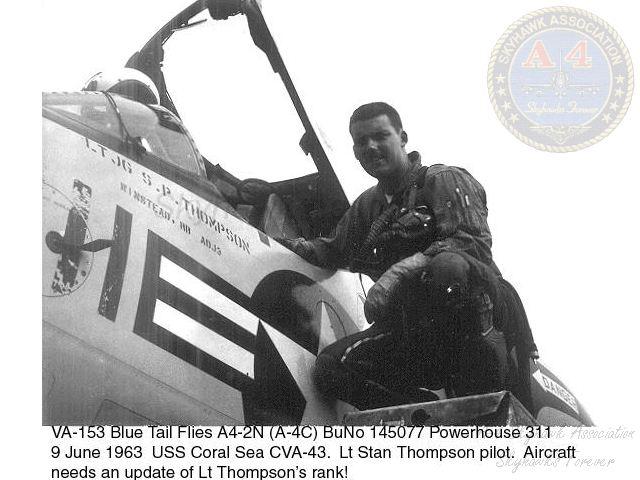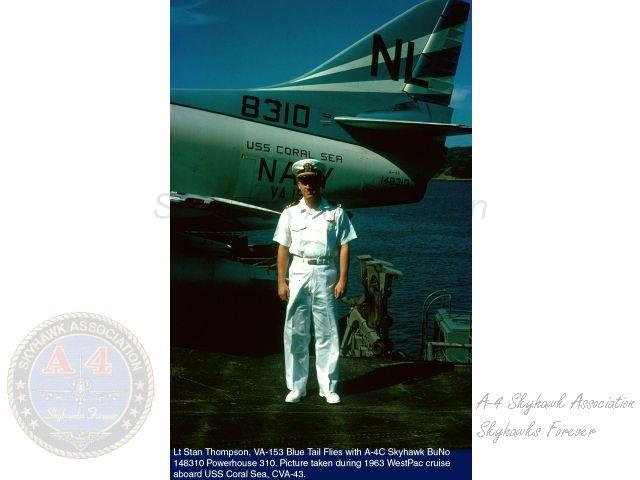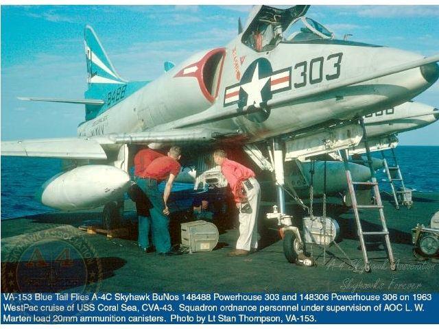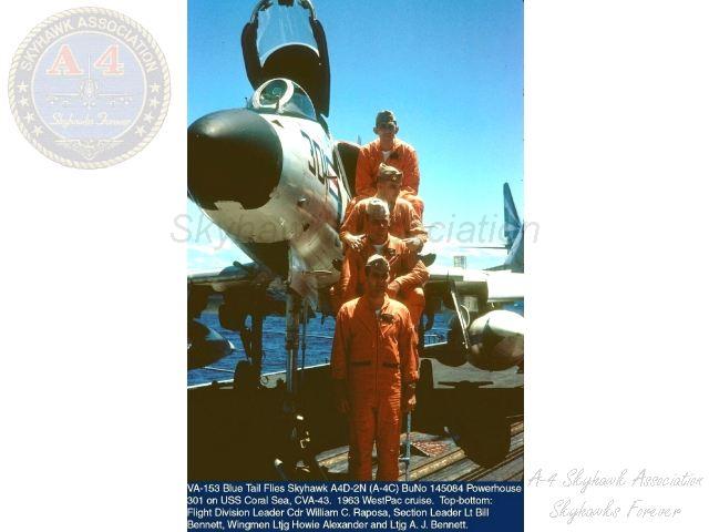 Unit Photos JUL59: NAN photo of Marines working on a J-65 engine. JUL59 NAN. U.S.S. Hancock Feb. 1958 - Jan. 1960: VA-153 Blue Tail Fly A4D-1 BuNo. 142156, side number NL 303, attached to CVG-15, is ready to go on the catapult (probably on the United States Ship Hancock CV 19). USN photograph from Douglas Aircraft Company files and provided by Harry S. Gann. 1960 U.S.S. Hancock: Blue Tail Flies Skyhawk NL-301 forms the backdrop for five pilots (CDR Jack Bauman, LCDR Ralph Odgers, LT's Jim Doolittle, Tom Brown & Ben Fromm) who became Centurions during the Westpac deployment. Naval Aviation News photo. 1960-61: Blue Tail Flies Skyhawk BuNo 142923 undergoing maintenance in the hangar. Douglas. U.S.S. Coral Sea SEP 1960: A-4C BuNo. 147825, side number NL 302, attached to CAW-15 aboard the United States Ship Coral Sea CVA-43 -- is pictured on the Naval Air Station Lemoore ramp. Blue Tail Fly A-4F BuNo. 155026, side number NL 306, attached to CAW-15 aboard the United States Ship Coral Sea CVA-43 -- is pictured on the Naval Air Station Lemoore ramp. Photograph by Harry S. Gann. 1961-62: A4D-2N Skyhawk BuNo 148307 Powerhouse 307, NL-307, USS Coral Sea, CVA-43, during the 1961-62 WestPac cruise. Front row Ens. H.J. Ferris, Lt. D.H. Westbrock, LCdr. R.R. Wilson, Lt. D.D. Owens, Ltjg A.J. Salkovics, LCdr. D.L. Johnson, Ltjg G.H. Hillhouse, Ltjg S.P. Thompson and Capt. (USAF) R.R. Sparkman. Second row: Ltjg R.A. Stromberg, Lt. W.O. Bennett, Lt. J.F. McCarthy, LCdr. J.E. Russ, Cdr. J.F. Kirklighter, Cdr. W.C. May, Cdr. W.R. Horner, Lt. R.P. Klugh, Ltjg G.W. Woehrmann, Ltjg M.A. McCarthy, Ltjg L.E. Printup and Ltjg F.O. Caron. 1961-1962 A4D-2N BuNo147844, Powerhouse 300, NL-300, aboard the USS Coral Sea, CVA-43, as Lt. Salkovics does a pre-flight. Photo by Stan Thompson. 1961-62: BuNo.145077 being manned by LTJG Stan Thompson aboard CVA-43, USS Coral Sea during the 1961-62 WestPac cruise. Photo by Stan Thompson. 1961-62: A4D-2N Skyhawk BuNo.148498 Powerhouse 313, NL-313, and VA-155 Silver Foxes A4D-2 BuNo 142849, NL-606, aboard the USS Coral Sea, CVA-43, opposite VF-154 F8U-2N Crusaders BuNo 147908, NL-406, and BuNo 148659, NL-409, and VF-151 Vigilantes F3H-2 Demon BuNo 146734, NL-102, 1961-62. Photo by Stan Thompson.. 1961-62: A4D-2N Skyhawk BuNo 145087, NL-309, inflight over Japan during the 1961-62 USS Coral Sea, CVA-43, WestPac cruise. Photo by Stan Thompson. 1961-62: A4D-2N Skyhawk BuNo 145087 ...Lt. Stan Thompson's VA-153 Blue Tail Flies A4D-2N Skyhawk BuNo 145087 Powerhouse 309, NL-309, inflight during the 1961-1962 Westpac cruise. Photo by Stan Thompson. 1961-62: A4D-2N Skyhawk BuNo 145087 Powerhouse 309, NL-309, inflight over Japan during the 1961-62 USS Coral Sea, CVA-43, WestPac cruise. Photo by Stan Thompson. 1961-62: A4D-2N Skyhawk BuNo 145087, Powerhouse 309, NL-309, inflight over Japan during the 1961-62 USS Coral Sea, CVA-43, WestPac cruise. Note exchange pilot USAF Capt. Ralph Sparkman's name beneath the canopy. Photo by Stan Thompson. 1961-62: BuNo.148307 as the pilot tries to uncock the nosewheel aboard the USS Coral Sea, CVA-43during the 1961-62 WestPac cruise. Photo by Stan Thompson. 1961-62: BuNo.148308 aboard CVA-43, USS Coral Sea during the 1961-62 WestPac cruise. Photo by Stan Thompson. 1961-62: A4D-2N Skyhawks BuNo.145087, NL-309, and BuNo 147825, NL-302, in formation over Japan during the 1961-62 USS Coral Sea, CVA-43, WestPac cruise. Photo by Stan Thompson. 1961-62: A4D-2N Skyhawk BuNo 148314, NL-304, flying above Mt. Fuji while temporarily based at NAS Atsugi, 1961-62. Photo by Stan Thompson. 1961-62: A4D-2N Skyhawk BuNo 148314, NL-304, in a bank over Mt. Fuji while temporarily based at NAS Atsugi, 1961-62. Photo by Stan Thompson. 1961-62: A4D-2N Skyhawk BuNo 148314, NL-304, flying over Mt. Fuji while temporarily based at NAS Atsugi. Photo by Stan Thompson. 1961-62: A4D-2N Skyhawk BuNo 148541 Powerhouse 312, NL-312, tanker getting the starter unit (huffer) attached at NAS Atsugi, Japan while the Blue Tail Flies were temporarily based ashore during the 1961-62 WestPac cruise. Photo from Stan Thompson. 07 May 1962: A4D-2N Skyhawk BuNo 148541, Powerhouse 312, NL-312, Lt(jg) Stan Thompson, coming aboard the USS Coral Sea, CVA-43, during the 1961-62 WestPac cruise. Photo from Stan Thompson. BuNo.145077 at Subic aboard CVA-43, USS Coral. Photo by Stan Thompson. 1963-65: Naval Air Station Lemoore ramp. A row of parked VA-153 A-4E Skyhawks at Naval Air Station Lemoore. From front right to rear left: BuNo. 147718 side number NL 313; BuNo. 148481; BuNo. 148310; BuNo. 149573; BuNo. 148306. Photograph by Harry S. Gann. BuNo.147825 at NAS Lemoore. Photo by Stan Thompson. 1961-62: A4D-2N Skyhawk BuNo 147825 Powerhouse 302, NL-302, inflight over Japan during the 1961-62 USS Coral Sea, CVA-43, WestPac cruise. Photo by Stan Thompson. 1961-62: Coral Sea: BuNo.147825 traps aboard CVA-43, USS Coral. Photo from Stan Thompson. LT Stan Thompson poses next to a Crusader. Photo by Stan Thompson. April 1962 CDR Kirklighter's Farewell. Photos from Stan Thompson. LTJG Hakanson, a "Demon" Driver. Photo by Stan Thompson. LT Owens and LT Thompson at NAS Atsugi. Photo by Stan Thompson. LTJG Printup aboard the Coral Sea. Photo by Stan Thompson. 1961-62 CVA-43: LCDR Jack Russ aboard the Coral Sea. Photo by Stan Thompson. Drawing illustrating the tanking role of the Skyhawk. Photo by Stan Thompson. LT Westbrock and LT Owens prepare for a flight. Photo by Stan Thompson. Stan Thompson VA-153 photo gallery for 1961-63 cruises. Photos by Stan Thompson. Thompson Sasebo Yen exchange. SDO: Thompson VA-153 SDO. Thompson CVA-43. Thompson CVA-43. CVA-43: Thompson CVA-43. CVA-43: Thompson 4. CVA-43: Thompson CVA-43 5. CVA-43: Thompson CVA-43 6. CVA-43: Thompson CVA-43 7. CVA-43: Thompson CVA-43 8. CVA-43: Thompson CVA-43 9. CVA-43: Thompson CVA-43 10. CVA-43: Thompson CVA-43 11. CVA-43: Thompson CVA-43 12. CVA-43: Thompson CVA-43 13. CVA-43: Thompson CVA-43 14. CVA43: Thompson CVA-43 15. CVA-43: Thompson CVA-43 16. CV