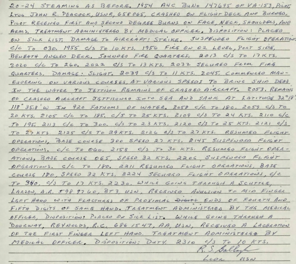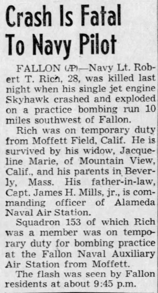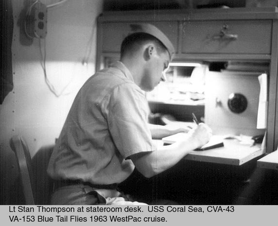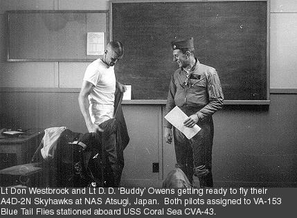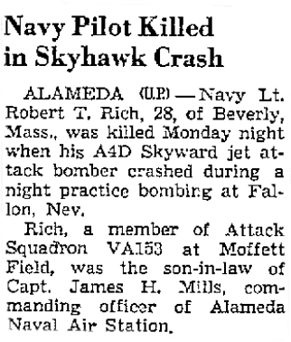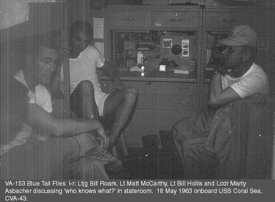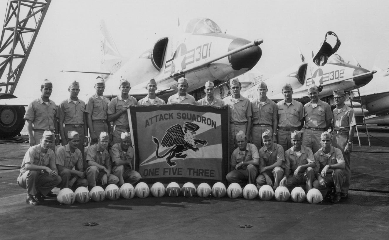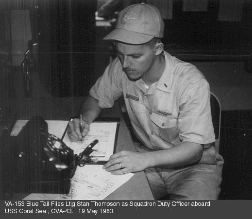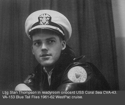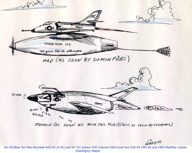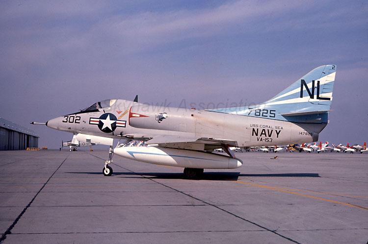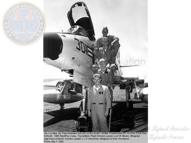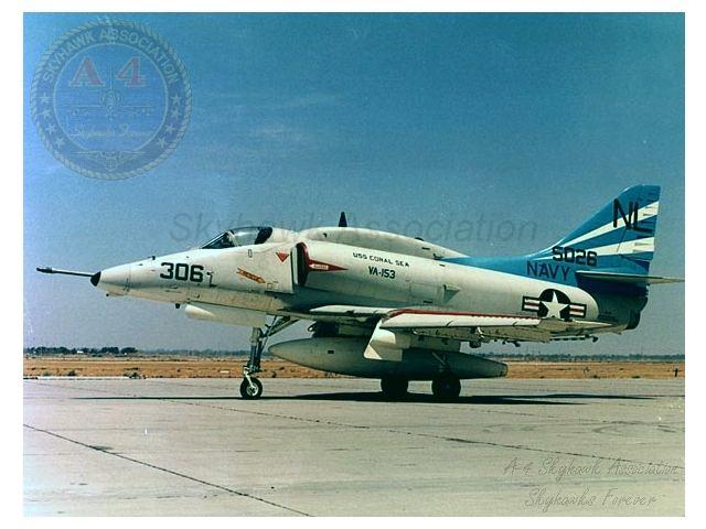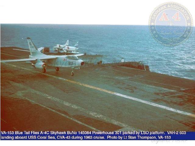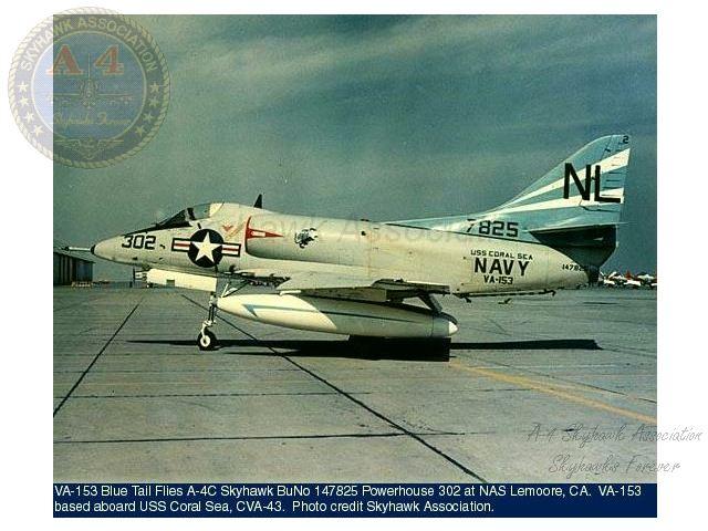 Events September 1949: Naval Air Reserve Fighter Squadron SEVEN HUNDRED EIGHTEEN (VF-718) was re-designated Fighter Squadron EIGHT HUNDRED THIRTY ONE (VF-831) at Naval Air Station New York Floyd Bennett Field. VF-718 and VF-831 both flew the Grumman F6F Hellcat. February 1, 1951: VF-831 Blue Tail Flies were called to active duty at Naval Air Station New York Floyd Bennett Field. April 1, 1951: VF-831 moved its home-port to Naval Air Station Alameda, California where the squadron transitioned into the Grumman F9F-2 Panther. September 8, 1951 to May 2, 1952: VF-831 Blue Tail; Flies flying the Grumman F9F-2 Panther under CVG-15 embarked on United States Ship Antietam CV 36 for combat over Korea. Grumman F9F-2 Panther BuNo. 125083 NL 300 is pictured on Antietam. USN Photograph. May 5, 1952: Upon return to CONUS VF-831 moved its home-port to Naval Air Station Moffett Field, California. January 24, 1953 to September 21, 1953: VF-831 flying the Grumman F9F-5 Panther under CVG-15 embarked on United States Ship Princeton CV 37 for a second combat cruise to Korea. February 4, 1953: VF-831 was re-designated Fighter Squadron ONE HUNDRED FIFTY THREE (VF-153 Blue Tail Flies) while deployed in Korean waters. August 1, 1954 to February 28, 1955: VF-153 Blue Tail Flies flying the Grumman F9F-6 Cougar under CVG-15 embarked on USS Yorktown CVA 10 for a cruise to WestPac. February 1955: Blue Tail Fly aircraft flew sorties from Yorktown in support of the evacuation of Chinese Nationalists from the Tachen Islands. December 15, 1956: VF-153 was redesignated Attack Squadron ONE HUNDRED FIFTY THREE (VA-153). The Blue Tail Flies were assigned the Douglas A4D-1 (A-4A) Skyhawk. The Squadron completed A-4A Skyhawk transition February 12, 1957. February 20, 1957: Cdr. Alexander D.C. Byers, 38, CO of VA-153 at NAS Moffett Field, was killed yesterday when his A4D (BuNo 142147) crashed into San Francisco Bay about one mile south of International Airport. The Daily Review, Hayward, CA, Thursday, Feb. 21, 1957. Cdr. Alexander D.C. Byers, 38, CO of VA-153 at NAS Moffett Field, was killed yesterday when his Skyhawk apparently developed engine trouble at a low altitude. He ejected, but the chute failed to open completely before he hit the water. He was recovered by a Coast Guard crash boat 8 minutes after his plane plunged into the water off the San Francisco International Airport. Oakland Tribune, Thursday, February 21, 1957. October 21, 1957: Lt. Robert T. Rich, 28, was killed when he crashed during a night practice bombing run at Fallon, NV. Rich was member of VA-153 at Moffet Field. Long Beach Independent, Wednesday October 23, 1957. Lt. Robert T. Rich, 28, was killed last night when his Skyhawk (BuNo 142143) crashed and exploded on a practice bombing run 10 miles SW of NAAS Fallon, NV. VA-153 was TAD to Fallon from NAS Moffett for bombing practice. The explosion was seen by Fallon residents about 9:45 p.m. Reno Gazette, Tuesday, 22 October 1957. November 21, 1957: Lt(jg). Douglas O. Sanford, 22, was killed Thursday night when his Skyhawk (BuNo 142217) jet caught fire hit the field and exploded during landing practice at Crows Landing. Redlands Daily Facts, Friday, Nov. 22, 1957. His A4D jet crashed to earth and burst into flame near Ward Ave., about three miles southwest of NALF Crows Landing on the Covell ranch about 200 feet off Ward. August 23 to September 9, 1958: The Blue Tail Flies flew sorties in the Taiwan Straits after the Chinese Communists bombarded Quemoy Island. October 27, 1958: VA-153 was assigned the Douglas A4D-2 (A-4B) Skyhawk. June 21 1959: Lt(jg). Alvin Allen was on a cross country when the Oil Pressure Flip/Flop Gauge became erratic prompting him to execute a "Precautionary Flameout Approach" to NAS Kingsville. With excessive speed the aircraft touched down 4,000 ft. down the runway, the tailhook was pulled from the aircraft, Field Arresting Gear failed, the fuselage and wing separated and caught fire off the runway end. Lt(jg). Allen was uninjured. From Jim Doolittle, VA-153 Maintenance Officer in 1959. February 15, 1960: Lt(jg). Gordon N. Blake and a housewife were killed when his VA-153 Skyhawk (BuNo 142919) hit a house on Emily Drive as he was coming in for a landing. The crash occurred a half mile from Moffett Boulevard, near NAS Moffett Field. Blake was seen to eject and to come down into the home his Skyhawk hit which, according to an eyewitness, was just an inferno. The Skyhawk glanced off the front part of the roof, crashed into a field and broke in half. The site is just south of the Bayshore highway just inside the Mountain View City line. San Mateo Times, Monday, February 15, 1960 September 8, 1960: Lt(jg). Richard E. Morton (VA-153 based at Moffett Field) was killed last night when his A4D-2 Skyhawk (BuNo 142925) plunged upside down just in front of the USS Coral Sea 115 miles NW of Santa Cruz due to insufficient airspeed on a night launch. Oakland Tribune, Friday, September 9, 1960. 2205 A4D BuNo 142925 with pilot LTJG R.E. Morton, USN, crashed into the water off the port bow at Latitude 37-32.2 N, Longitude 122-45.2 W, following an unsuccessful port catapult launch. Ship's course is 300, speed 27 knots. Commanding Officer ordered left 5 deg. rudder and all engines stop to avoid the aircraft. USS Preston and USS Everett F. Larson commenced searching for the pilot. Maneuvering to remain clear of search area. 2310 Motor Whaleboat from USS Preston came alongside and delivered the pilot's helmet and part of the aircraft recovered in their search. 2335 USS Coral Sea discontinued search and c/c to 089, c/s to 17 knots. USS Preston detached. USS Everett Larson ordered to remain at the crash area and search for the pilot until sunrise. USS Coral Sea deck log, 8 September 1960. September 19, 1960: USS Coral Sea (CVA 43), with VA-153 embarked, operated in the South China Sea after Pathet Lao forces captured strategic positions in Laos. January 6, 1961: Lt. Tom Joseph Cress was killed when his A4