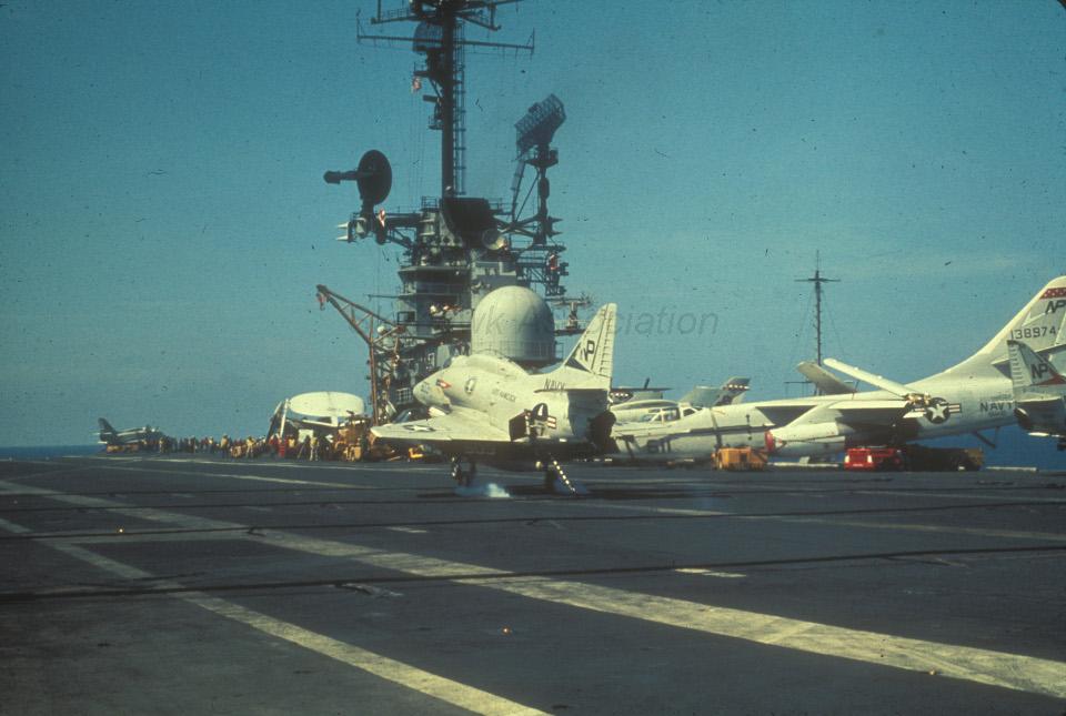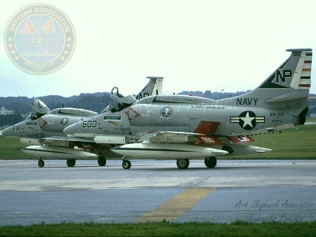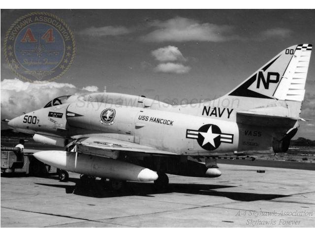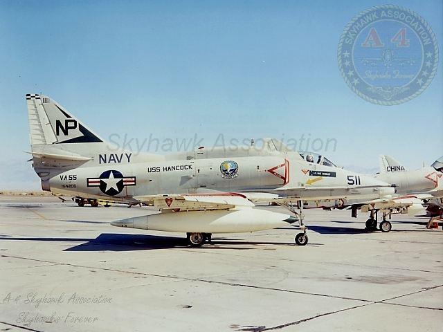 August 2, 1969, to April 15, 1970: VA-55 flying the A-4F Skyhawk deployed with CVW-21 to WestPac on USS Hancock, CVA-19 for the Warhorses fifth combat cruise to Vietnam. March 14, 1970: Lt(jg). Peter A. Schranz ejected from A-4F Skyhawk BuNo 155035, NP-501, and was rescued the following morning by a USAF helicopter with no injuries after he was hit by 37mm AAA during a night attack on a target near Ban Kate in southern Laos. I happened to be on the ship when it happened. In fact, it was my first tour and had only been with 55 for a few days. From Denny Sapp. 2116 hours A-4 aircraft 501 failed to report back to ship. Pilot Lt(jg). Peter Schranz. Injuries to pilot unknown. USS Hancock deck log, 14 March 1967. October 22, 1970, to June 3, 1971: VA-55 flying the A-4F Skyhawk deployed with CVW-21 to WestPac on USS Hancock, CVA-19 for the Warhorses sixth combat cruise to Vietnam. VA-55 had no operational or combat losses this cruise. January 7, 1972, to October 3, 1972: VA-55 flying the A-4F Skyhawk deployed with CVW-21 to WestPac on USS Hancock, CVA-19 for the Warhorses seventh combat cruise to Vietnam. March 8, 1972: Cdr. George J. Fenzil, Jr. (CO) ejected and was rescued when his Navy A-4 Skyhawk (BuNo 154205) fighter-bomber crashed Wednesday 12 miles northwest of the Da Nang air base because of mechanical reasons. Long Beach, CA, Press-Telegram, Long Beach, Thursday, March 9, 1972. He ejected short of Da Nang with 3,000 pounds of trapped fuel but wrote it off as a combat loss according to Denny Sapp. Cdr. George J. Fenzel ejected and was rescued by a USAF helicopter 12 miles NW of Da Nang after his Skyhawk was hit by AAA on his sixth bombing run on a Steel Tiger strike. Hobson. April 1972: The squadron participated in Operation Freedom Train, tactical air sorties against military and logistic targets in the southern part of North Vietnam. It also provided close air support for forces in South Vietnam following a massive invasion by North Vietnam. May 1972: Participated in the early phase of operation Linebacker I, heavy air strikes against targets in North Vietnam. May 27, 1972: Lt. Thomas B. Latendresse ejected from A-4F Skyhawk BuNo 155048, NP-512, 15-miles S of Vinh and was captured when his Skyhawk was hit in the port wing by AAA while pulling up from an attack on a flak site. He ejected about 14 miles south of Vinh and suffered severe injuries during the ejection. May 27, 1972: Lt. Jack J. Zerr ejected from A-4F Skyhawk BuNo 154197, NP-502, and was rescued when the engine failed on launch. 1714 Plane in the water port side. Ships position 18-47.8N 107-26.3 W. Water depth 30 fathoms. Aircraft was an A-4. 1714 Pilot LT J.J. Zerr recovered in safe condition. USS Hancock deck log, 27 May 1972. Warhorse NP 502 was the replacement a/c for 502 lost on 08 March 1972 while flown by CDR Fenzil. No other aircraft was assigned side number 502 while Cdr. Fenzil was in command. Charles H. Trotter AO2 VA-55 1970-73. July 11, 1972: LCdr. Henry D. Lesesne ejected and was captured when his A-4F Skyhawk BuNo 155046, side number NP 501, was hit by a SA-2 missile during an Iron Hand mission attacking a SAM site near the Red River 20-miles SW of Hai Duong. LCdr. Lesesne had received a SAM warning and was diving in a split S maneuver at 11,00 feet when he was hit, and flames engulfed the tail section and the aircraft began rolling uncontrollably. March 6, 1973: Lt. Bill Harmon was bingoed to NALF San Clemente in A-4F BuNo 154210, ran out of fuel, ejected, and spent 3 hours in the water, at night, before the helo found him unhurt. From Denny Sapp. A4 pilot down in water, approximate position 32-58N, 118.52W, at 2000. Recovered pilot aboard by helo 006 at 2115. Pilot was Lt. Harmon and superficially and unofficially appears unhurt. USS Hancock, Deck Log, Tuesday, March 6, 1973. USS Hancock, Deck Log (cont.), Tuesday, March 6, 1973. The pilot commenced his approach to the ship but was waved off for being low and slow. During the second approach the carrier entered a rain shower, and he was waved off again and told to rendezvous with the A-3 tanker and proceed to the divert field. The ship directed the two aircraft to tank at 5,000 feet: however, there were clouds at 5,000 feet, so the Skyhawk was directed to proceed to the bingo field and tank enroute. As the Skyhawk continued to climb to 30,000 feet its fuel state was approaching a critical condition. Upon reaching 30,000 feet the Skyhawk commenced an idle descent and finally spotted the tanker. While attempting to plug-in in rough weather the A-4 flamed out due to fuel starvation. The pilot ejected and was picked up by the ship's helo. NAN, Pettibone, July 1973. I think it was just a night CQ evolution, but Billy got stacked over the ship and was running low on fuel. He asked to bingo and was told to standby. He was finally vectored to an A-3 tanker which wasn’t where they thought it was. Then he was vectored back overhead to plug the A-3. By this time, he was down to 500 lbs. or so. He’d never plugged an A-3 before, the basket wasn’t lit and was swinging around, and he couldn’t make contact. He broke off and headed to NALF San Clemente but flamed out in route. He spent quite a while in his raft before they picked him up and was suffering from hypothermia when they finally got him back aboard. Denny Sapp. A-4 time was mostly "F"s from 1969-1977. Squadrons were VA-55 1970-72, China Lake 1973-1974, Blue Angel Solo Pilot 1975-76.