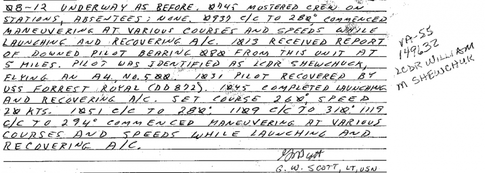 08/22/43 - 09/07/43 - CVG-5 - CV 10 - TBF-1--Pacific 09/27/43 - 10/11/43 - CVG-5 - CV 10 - TBF-1 --Pacific 11/10/43 - 12/09/43 - CVG-5 - CV 10 - TBF-1C -Pacific 01/16/44 - 05/11/44 - CVG-5 - CV 10 - TBF-1C --Pacific 03/03/45 - 03/19/45 - CVG-5 - CV 13 - TBF-3 --Pacific 03/31/47 - 06/16/47 - CVG-5 - CV 38 - TBM-3E/Q/J -WestPac 05/01/50 - 12/01/50 - CVG-5 - CV 45 - AD-4/4Q -WestPac/Korea 05/16/51 - 08/29/51 - CVG-19- CV 37 - AD-4/4Q/4W -WestPac/Korea 06/16/52 - 02/06/53 - ATG-2 - CVA 9 - AD-4/4B -WestPac/Korea 12/01/53 - 07/12/54 - ATG-2 - CVA 9 - AD-4/4B -WestPac 04/01/55 - 11/23/55 - ATG-2 - CVA 47 - AD-6 - WestPac 04/06/57 - 09/18/57 - ATG-2 - CVA 19 - AD-6/7 - WestPac 08/21/58 - 01/12/59 - ATG-4 - CVA 20 - FJ-4B -WestPac 03/06/60 - 10/11/60 - CVG-5 - CVA 14 - A4D-2 -WestPac 05/10/61 - 01/15/62 - CVG-5 - CVA 14 - A4D-2 -WestPac 07/25/62 - 09/17/62 - CVG-5 - CVA 64 - A4D-2 -SoLant/West Coast 01/03/63 - 07/15/63 - CVG-5 - CVA 14 - A-4C - WestPac 04/14/64 - 12/15/64 - CVW-5 - CVA 14 - A-4E -WestPac/Vietnam 12/10/65 - 08/26/66 - CVW-14 - CVA 61 - A-4E -WestPac/Vietnam 04/29/67 - 12/04/67 - CVW-14 - CVA 64 - A-4C -WestPac/Vietnam 07/18/68 - 03/03/69 - CVW-21 - CVA 19 - A-4F - WestPac/Vietnam 08/02/69 - 04/15/70 - CVW-21 - CVA 19 - A-4F -WestPac/Vietnam 10/22/70 - 06/03/71 - CVW-21 - CVA 19 - A-4F -WestPac/Vietnam 01/07/72 - 10/03/72 - CVW-21 - CVA 19 - A-4F -WestPac/Vietnam 05/08/73 - 01/08/74 - CVW-21 - CVA 19 - A-4F -WestPac/IO 03/18/75 - 10/20/75 - CVW-21 - CV 19 - A-4F - WestPac |