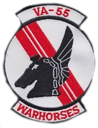 Patch Torpedo Squadron FIVE's first patch, the "TORPCAT" patch was used early in 1943. This patch was of a horned black cat, grasping a rat, astride a torpedo. July 10, 1946, Torpedo Squadron FIVE designed a new "TORPCAT" patch, that retained the cat and torpedo motif. The new "TORPCAT" design was the face of a cat grasping a torpedo in its mouth. The new "TORPCAT" patch was used by VT-5, VA-6A and VA-55 until September 1955. Note that CV-20 patch was the last cruise before VA-55 received Skyhawks. On September 27, 1955 VA-55 had a new "Winged Seahorse" patch approved. The "Winged Seahorse" patch has now became a well-known design and was used until VA-55 was disestablished. Late 1967/Early 1968: VA-55 adds the Shrike to the squadron patch 1969 while the Warhorses were engaged in combat this version of the "Winged Seahorse" was used. On May 12, 1983 the re-established VA-55 adopted a reverse image of the "Winged Seahorse" patch and added a banner at the bottom with the identification "ATKRON-55." |