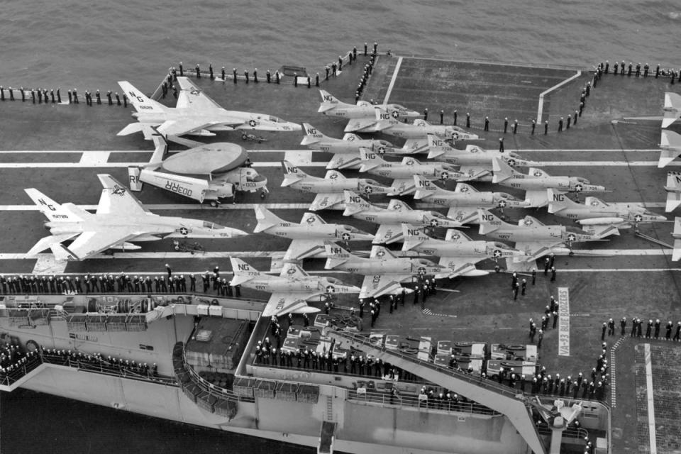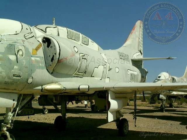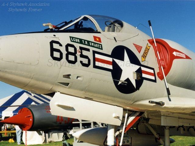 Unit Photos 1959: C.O. Cheuvront's new Skyhawk. 1961: USS Intrepid based Spirits Skyhawk Attack Bomber formation zooms over home. Joe Morris. 1961: USS Intrepid based Spirits Skyhawk formation, from l-r: BuNo 144990, AF-507, BuNo 144988, AF-500, BuNo 142767, AF-511 and BuNo 144953, AF-502. Joe Morris. 1961: BuNo 142784, AF-508, tied down on the deck of the USS Intrepid with six mk-81s on each wing and a centerline fuel tank. Gary Verver Collection. 1961: L-R: VA-76 A4D-2 BuNo 142718, AF-510, BuNo 142789, AF-501, BuNo 144953, AF-502 and BuNo 144990, AF-507. MAY62: Air Group Six Centurions representing 12,010 arrested landings pose in front of Spirits Skyhawk BuNo 144976, AF-507, after completing a Sixth Fleet deployment aboard the USS Intrepid. Naval Aviation News Photo. 1965: BuNo.147704 being "hoisted" aboard the Enterprise in 1965. Photo is U.S. Navy. 1962: USS Enterprise (CVAN-65) with aircraft from CVW-6 (NE) on deck including VF-102 Diamondbacks F4H-1 Phantom II, VF-33 Tarsiers F8U-2NE Crusaders, VA-66 Waldos A4D-2N Skyhawks, VA-65 Tigers AD-6 Skyraiders, VA-64 Black Lancers A4D-2N Skyhawks, VA-76 Spirits A4D-2N Skyhawks, VAH-7 Peacemakers A3J-1 Vigilantes, VAW-12 Det. 65 WF-2 Tracers, VFP-62 Eyes of the Fleet Det. 65 F8U-1P Crusaders and HU-2 Fleet Angels Det. 65 HUP-2 Retrievers, August-December 1962. OCT-DEC 1962: BuNo 148452 AF-503 parked forward on CVN-65 during the Cuban Missile Crisis. Dave Leiber - VMA-225 NOV-DEC 1962: Skyhawks parked forward of the island on CVN-65 during the Cuban Missile Crisis. CVW-6 Tail Code was "AF" until late in 1962, when it changed to "AE". Normally VA-66 and VA-76 Skyhawks provided the light attack jets for CVW-6 aboard CVN-65; the "CE" A4-C Skyhawks are VMA-225 brought aboard for additional fire-power as were VA-64 Skyhawks. Shown are BuNo 148606 of VA-64, 149522 as AF-606 of VA-76, 149618 of VA-64, an AD-6 Skyraider "SPAD" of VA-65, 147769 as CE-12 of VMA-225, 145131 as CE-16 of VMA-225, 147776 as CE-02 of VMA-225 and 147739 as CE-14 of VMA-225. BuNo.147704, AE-501, ready for launch from the USS Enterprise with a pair of drop tanks attached. Wynn Foster. 05 APR 1965: VA-76 Spirits A-4C Skyhawk BuNo 147704, AE-501 launches from the waist cat of CVA-66 during trials for the first cruise. Ships XO CDR K.B. Austin in VA-76 Skyhawk BuNo 147704, AE-501, is ready for the 1st launch. In the cockpit for this first launch is CVA-66 XO CDR Kenneth B. Austin. Jack R. Hansen USS America CVA66 Cruise Book. 05 APR 1965: VA-76 Spirits A-4C Skyhawk BuNo 147704, AE-501, traps aboard CVA-66 during trials for the first cruise. Jack R. Hansen USS America CVA66 Cruise Book. 1965-1966: VA-76 Spirits A-4C Skyhawk BuNo 147704, AE-501, being re-spotted aboard CVA-66 during trials for the first cruise. Jack R. Hansen USS America CVA66 Cruise Book. 13 DEC 1965: VA-76 Spirits A-4C Skyhawk BuNo 147843 , AE-506, aboard CVA-66 during trials for the first cruise. Jack R. Hansen USS America CVA66 Cruise Book. 1965: VA-76 Spirits A-4C Skyhawk BuNo 149521, AE-502, being spotted on the cat aboard CVA-66 during trials for the first cruise. Jack R. Hansen USS America CVA66 Cruise Book. 1965: VA-76 Spirits A-4C Skyhawk BuNo 149521, AE-502, fire fighting exercise aboard CVA-66 during trials for the first cruise. Jack R. Hansen USS America CVA66 Cruise Book. 21 JUN 1966 Taken from Golden Gate Bridge, from l to r, bottom to top; 147724 VA-76 NG-714, 147807 VA-76 NG-5xx, 149629 VA-76 NG-503, 149498 VA-76 NG-515, 148610 VA-76 NG-501, 147696 VA-36 NG-7xx, 147747 VA-36 NG-711, 148484 VA-36 NG-707, 147678 VA-36 NG-715, 147764 VA-36 NG-710, 148520 VA-36 NG-713, 147709 VA-36 NG-716, 149520 VA-36 NG-705, 147809 VA-36 NG-704, and at the point an unknown VA-36 Road Runner NG-7xx. Willam Larkins. 1966: USS Enterprise (CVAN-65) with aircraft from CVW-9 (NG) on deck including VF-92 Silver Kings F-4B Phantoms, VF-96 Falcons F-4B Phantoms, VA-36 Roadrunners A-4C Skyhawks, VA-76 Spirits A-4C Skyhawks, VA-93 Blue Blasters A-4C Skyhawks, VA-94 Mighty Shrikes A-4C Skyhawks, VAH-4 Fourrunners Det M A-3B Skywarriors, RVAH-7 Peacemakers RA-5C Vigilantes, VAW-11 Early Elevens Det M E-1B Tracers, HC-1 Fleet Angels Det M UH-2A/B Seasprites, VQ-1 Det EA-3B Skywarriors and VAP-61 World Recorders Det RA-3B Skywarriors, circa 1965-1966. Pic 2. MAY 1967: CDR Homer L. Smith launches in an A-4C Skyhawk. VA-76 was with CVW-21 aboard CVA-31, the Bon Homme Richard, cruising the WestPac. Photo by JOC Robert D. Moeser. 24 MAY 1967: Spirits Skyhawk BuNo 147843, NP-684, bolters from the Bonnie Dick after it failed to catch an arresting wire when returning from a combat mission. U.S. Navy. 1967: VA-76 Spirits A-4C Skyhawks from the USS Bon Homme Richard over the USS Sproston (DD-577). L-r BuNo 147843, NP-684, BuNo 147792, NP-687, BuNo unknown, NP-689, and BuNo 148314, NP-681. Official U.S. Navy photo. 1968: USS Independence and CVW-7 (AG) aircraft in 1968. The Air Group squadrons/aircraft were VF-41 Black Aces F-4J Phantoms, VF-84 Jolly Rogers F-4J Phantoms, VA-76 Spirits A-4C Skyhawks, RVAH-7 Peacemakers RA-5C Vigilantes, VAH-10 Vikings Det. 62(KA-3B Skywarriors, VSF-1 Warhawks A-4C Skyhawks, VA-64 Black Lancers A-4C Skyhawks, VAQ-33 Firebirds Det. 62 EA-1F Skyraiders, VAW-124 Bear Aces E-2A Hawkeyes and HC-2 Fleet Angels Det. UH-2B Seasprites, 1968./p> 1968: VSF-1 Skyhawk BuNo 150598, AG-514, BuNo 147703, AG-503, and Spirits BuNo 147749, AG-310, as they prepare to launch from the Independence. Note the Plane Guard is about to launch. U.S. Navy from "Boom" Powell. 1968: Spirit A-4C Skyhawk. Spirit Skyhawk parked on the USS Independence CVA-62. Plane Captain John Lowry in the cockpit. Picture from John Lowry. BuNo.149540 with VA-76. Michael Blackstock. FEB69: BuNo 149645, AF-301, assigned to CDR Joe Barth parked on the line. Note the MiG marking on the port intake. Unknown photographer via W. Mutza. 2004: BuNo.149540, Spring 2004, as it rests at the Marana Airport awaiting its fate with ATW Aviation. Off-Duty Photos None yet.