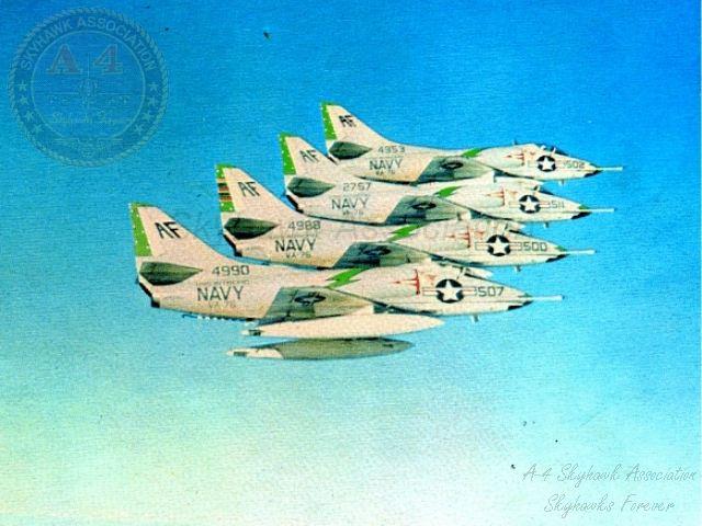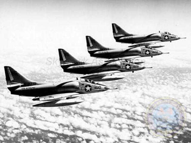 Date Type First Received - - - - - - Type of Aircraft: July 1955- - - - - - - - - - - - McDonnell F2H-2 Banshee January 1956 - - - - - - - - - - Grumman F9F-6 Cougar * April 1956 - - - - - - - - - - - Grumman F9F-8B Cougar * May 1959 - - - - - - - - - - - - Douglas A4D-2 (A-4B) Skyhawk ** March 1962 - - - - - - - - - - - Douglas A4D-2N (A-4C) Skyhawk ** * The F9F through the F9F-5 Panther have straight wings; The F9F-6 through the F9F-8 Cougar have swept wings. ** November 30, 1962 The A4D-2 designation was changed to A-4B The A4D-2N designation was changed to A-4C For A-4 Skyhawk aircraft assigned to this unit see lower in this page: |