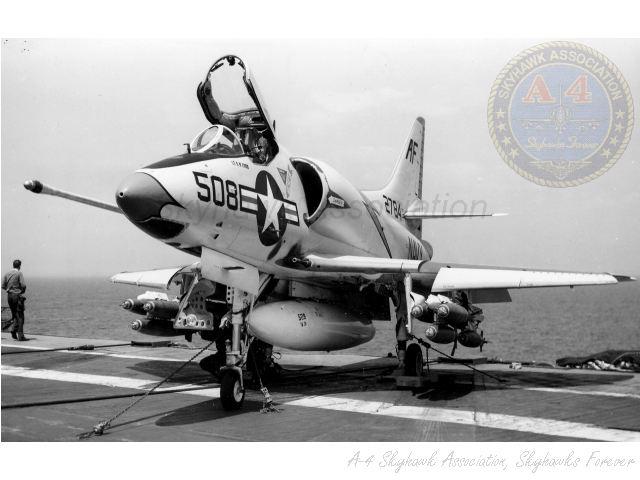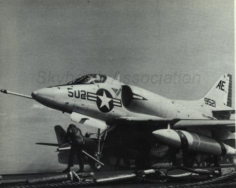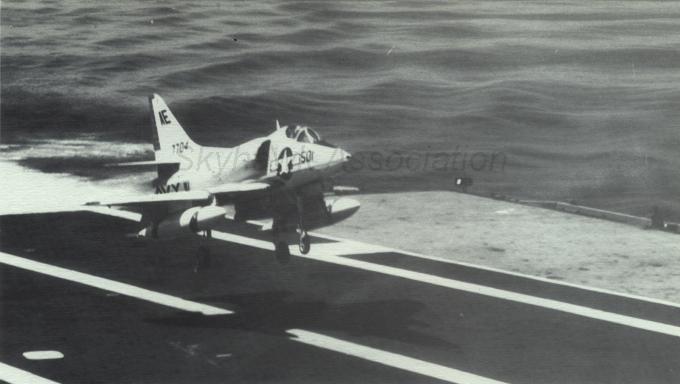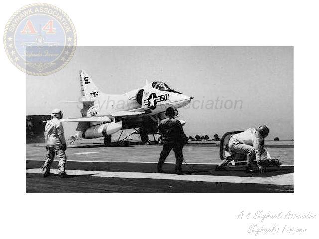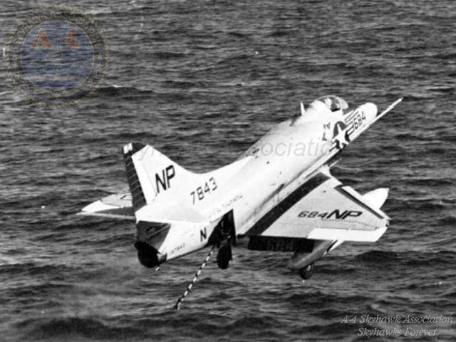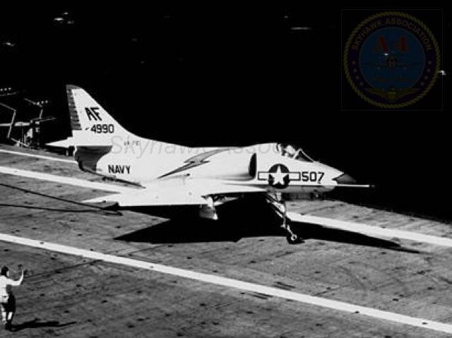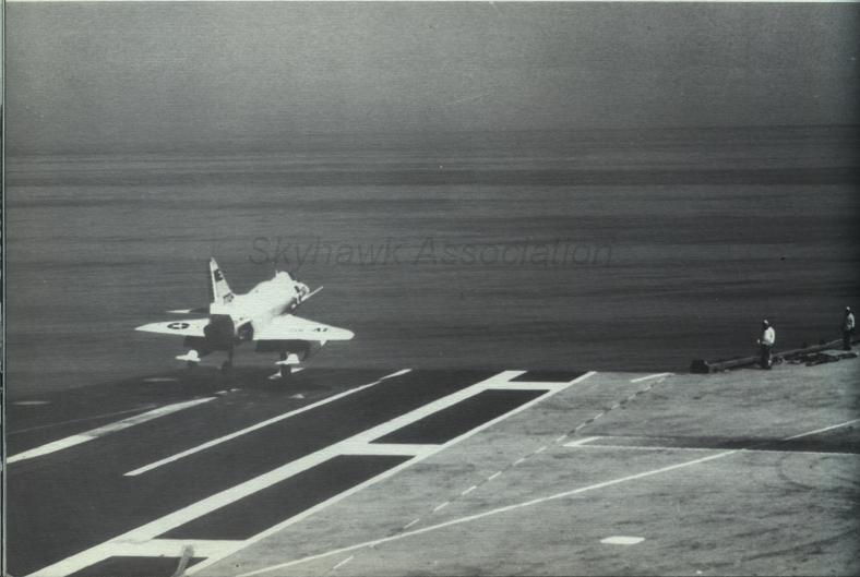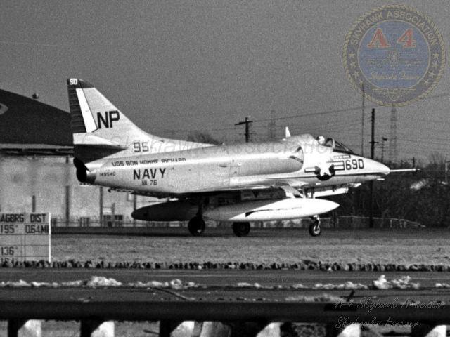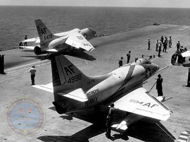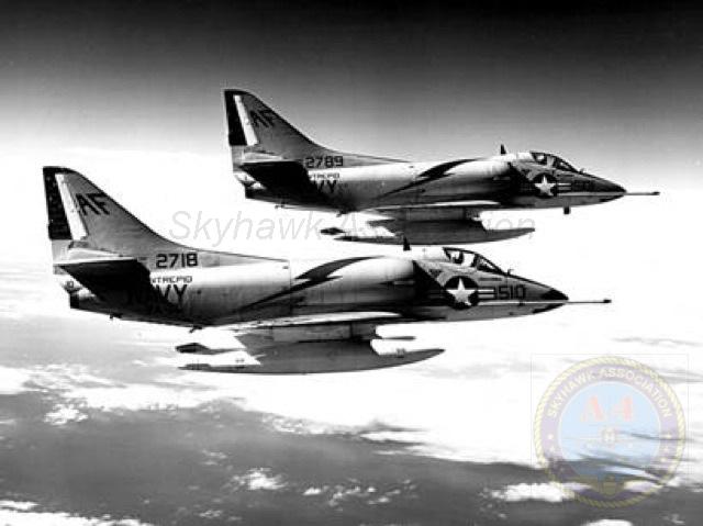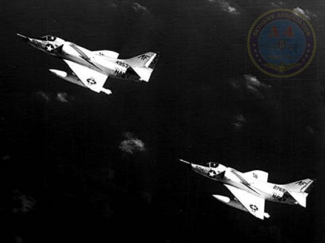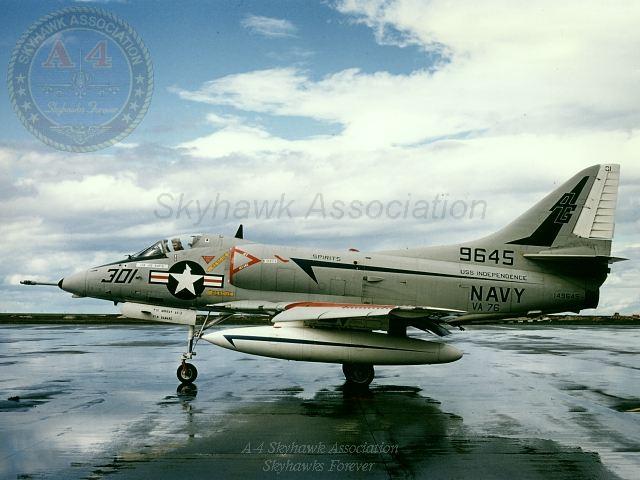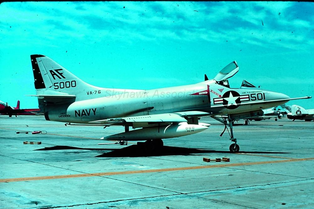 Events June 1, 1955: Attack Squadron SEVENTY-SIX (VA-76) was established. The squadron was assigned the McDonnell F2H-2 Banshee. January 1956: The Spirits were assigned the Grumman F9F-6 Cougar. November to December 1956: During the Suez Crisis VA-76 Spirits were deployed on board USS Forrestal CVA 59, off the coast of the Azores awaiting a call to enter the Mediterranean if necessary. May 1959: The Spirits were assigned the Douglas A4D-2 (A-4B) Skyhawk. January 30, 1960: Lt.(jg) Orrie Griffith Hiett ejected safely from A4D-2 Skyhawk BuNo 145005. One of his most memorable experiences was when his plane caught fire during an in-air refueling maneuver, and he had to bail out into the Caribbean Sea. June 27, 1960: Lt. Gerry L. Stark ejected safely from A4D-2 BuNo 142755. A small fishing vessel yesterday picked up a Navy pilot who ejected from his disabled jet fighter. The plane crashed near Knotts Island, NC. The pilot, Lt. Gerry L. Stark, was unhurt. He was on a training flight from the aircraft carrier Intrepid. A helicopter flew him to NAS Oceana. His plane developed engine trouble. The Progress-Index, Tuesday, June 28, 1960. >June 1961: Deployed on board USS Intrepid CVA 11, in the Caribbean during the Dominican Republic crisis.> 6 Jan 1962: Executive Officer LCDR James T. Peddy, Jr. lost in A-4C BuNo 148454 in an operational launch accident in the Western Mediterranean Sea. 2031 A4D-1 BuNo 148454, pilot LCdr. James T. Peddy crashed into the sea shortly after being launched. Crash location: Lat. 40-23.1N, Long. 13-16.9E. 2033 USS Bordelon (DD-881) dispatched to conduct search. 2145 USS Bordelon (DD-881) recovered parts of aircraft and found positive evidence of pilot's death in crash. 2216 USS Bordelon (DD-881) concluded search. The pilot was not recovered. USS Intrepid deck log, Saturday, 6 January 1962. March 1962: The Spirits were assigned the Douglas A4D-2N (A-4C) Skyhawk. October 19 through December 8, 1962: VA-76 deployed on board United States Ship Enterprise CVAN 65, off Cuba during the Cuban Missile Crisis and naval blockade. January 31, 1964: Lt. J.W. Thornton, 25, was still missing Saturday after his A4C jet (BuNo 148455) crashed in the ocean Friday night shortly after take-off from NAS Oceana on an eastern coast training flight. Lt. Thornton's body has not been recovered. Longview News Journal, Sunday, February 2, 1964. Lt. J.W. Thornton, 25, was killed when his A4C jet crashed in the ocean Friday night shortly after takeoff from NAS Oceana on a training flight. The Montgomery Advertiser, Sunday, February 2, 1964. March 1964: Deployed in the Mediterranean on board USS Enterprise CVAN 65, near Cyprus during Turk-Greek Cypriot crisis. May 29 to June 15, 1965: While temporarily based ashore at Naval Station Roosevelt Roads, Puerto Rico, VA-76 flew armed reconnaissance during crisis in Dominican Republic. October 26, 1965, to June 21, 1966: The first of two VA-76 combat cruises to WestPac-Vietnam. VA-76 flew the A-4C Skyhawk with CVW-9 and struck from USS Enterprise CVAN 65. December 22, 1965: Lt. John Douglas Prudhomme, No. 2 (BuNo 149521) in a four-plane section, was killed when the section made a low-level left turn approach to the Uong Bi power plant, and he was seen to level his wings and fly into the ground. January 2, 1966: Lt.(jg) Donald Clay MacLaughlin (BuNo 147704) KIA, crashed on slope of mountainside in thick fog, Duc Pho, Quang Ngai Province, SVN March 25, 1966: Lt.(jg) Bradley Edsel Smith ejected and was captured when he was hit by AAA while in a shallow dive and his aircraft burst into flames while attacking a road ferry across the Sou Giang River near Bau Khe and Tho Ngoa. On March 25, 1966, he launched as one of a section of three aircraft on an armed reconnaissance mission on the Quang Khe highway ferry in Quang Binh Province, North Vietnam. During the bombing run, radio contact was lost with Smith. His wingman alerted the search and rescue aircraft. There was no trace of aircraft wreckage or fire. No flak was observed in the target area during the bombing runs. Radio Hanoi broadcast later reported that North Vietnamese forces shot down one U.S. aircraft on March 25 over Quang Binh City, and that the pilot had been captured. May 11, 1966: Attack Squadron SEVENTY-SIX Commanding Officer, Cdr. J. B. Linder, awarded Silver Star for leading a strike against a mobile SAM site at Thanh Hoa, North Vietnam. December 6, 1966: VA-76 Commanding Officer, Cdr. Albert D. McFall, perished in A-4C BuNo 149549 following a night catapult launch from USS Bon Homme Richard CVA 31. Long Beach, CA Press-Telegram. 2016 A4C BuNo 149549 of VA-76, pilot CDR A.D. McFall, crashed into the sea off the starboard bow after being launched from the starboard catapult at Latitude 32-28.8N Longitude 118-01.0W in 1,000 fathoms of water. Stopped all engines. 2017 Commenced maneuvering on various courses at various speeds while maneuvering to clear aircraft wreckage and execute Williamson turn. Helicopter commenced search for pilot. 2019 USS Edson (DD-946) ordered to close for search. 2026 All engines stop. Lying to in area of crash. Maneuvering engines to maintain position. 2046 commenced backing clear of crash site. 2114 USS Wedderburn (DD-684) joined the search. 2115 USS Fox (DLG-33) closed this ship. 2119 USS Fox assumed OTC of SAR effort. USS Gallup (PGM-85) joined the search. USS Bon Homme Richard CVA-31 deck log, Tuesday 06 December 1966. January 26, 1967, to August 25, 1967: The second of two VA-76 combat cruises to WestPac-Vietnam. VA-76 flew the A-4C Skyhawk with CVW-21 and struck from USS Bon Homme Richard CVA 31. April 25, 1967: Lt. Charles David Stackhouse ejected and was captured when he was shot down by a MiG-17 during an attack on POL and ammo storage sites at Haiphong. I had dropped my bombs and was in the process of shooting a MiG 17 on my wingman's tail while another MiG was shooting at me. The second time he hit me I started rolling ... I was already on fire from the first hit f