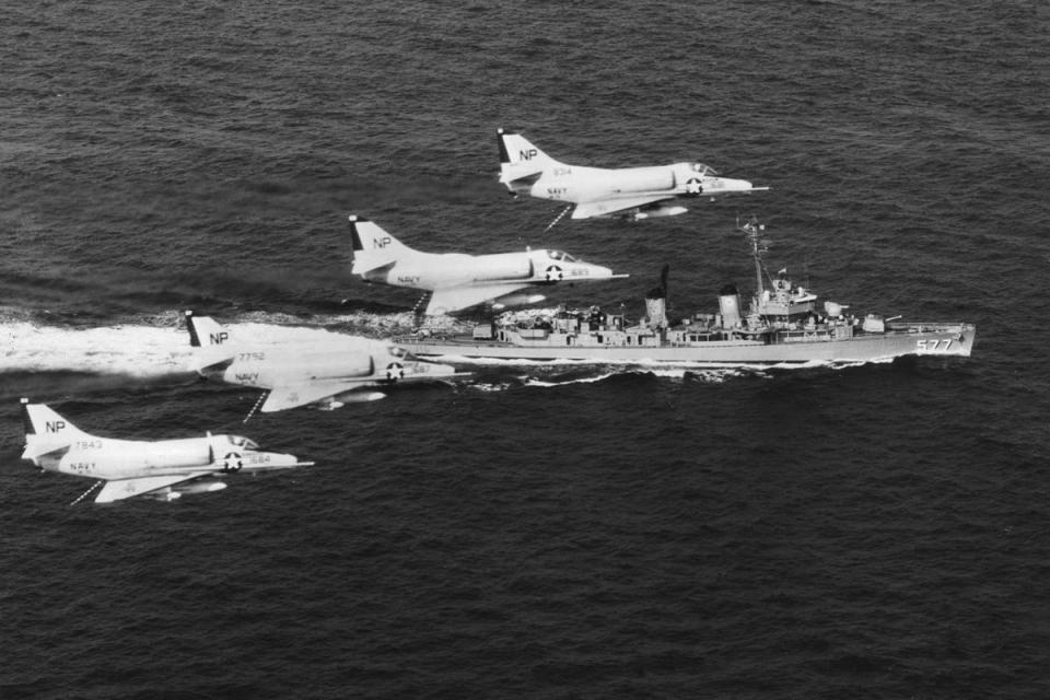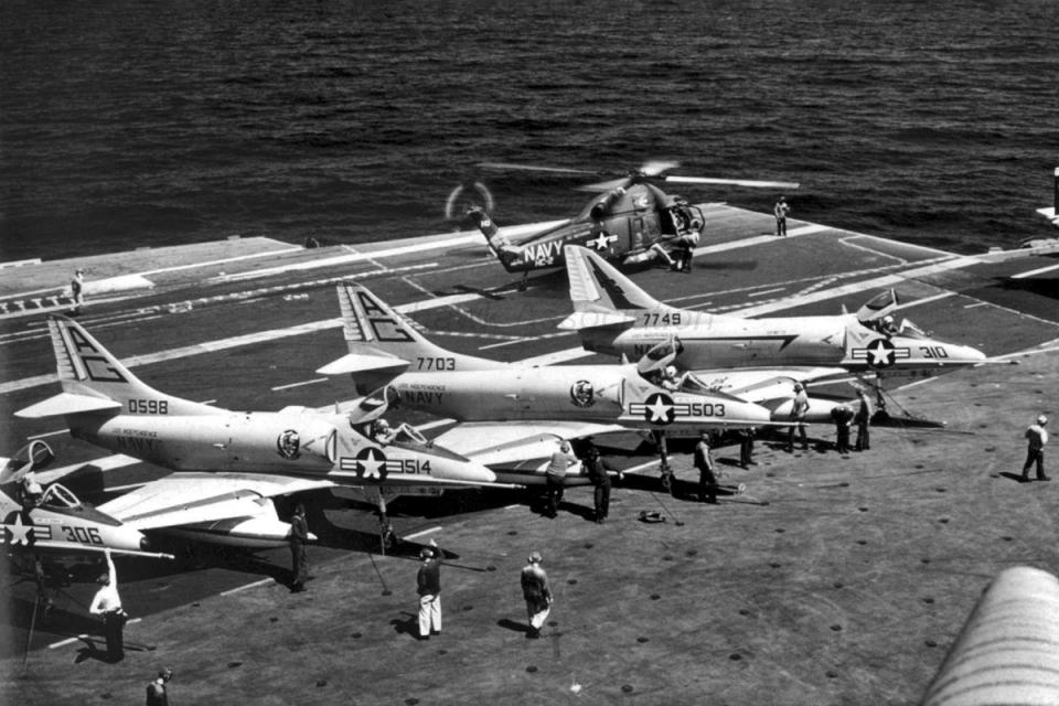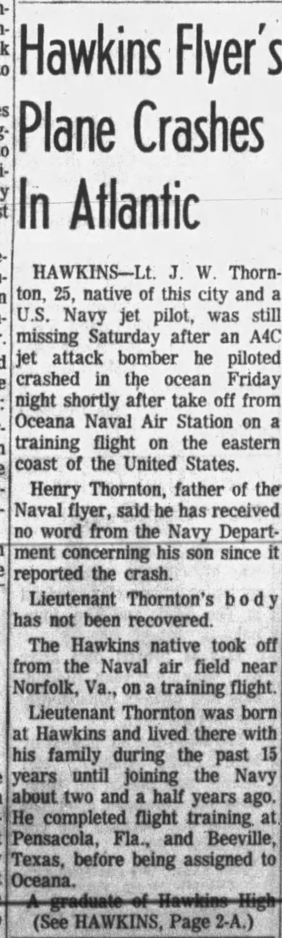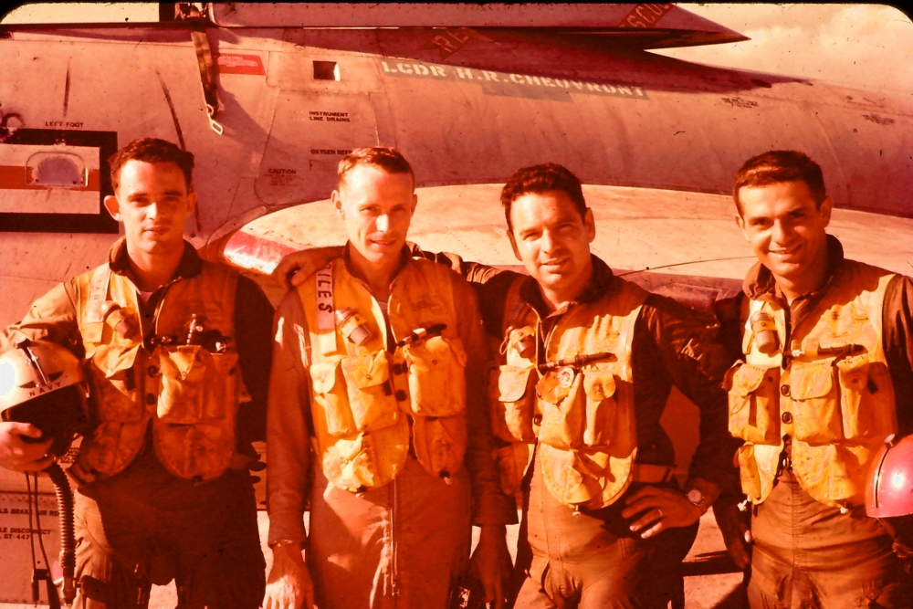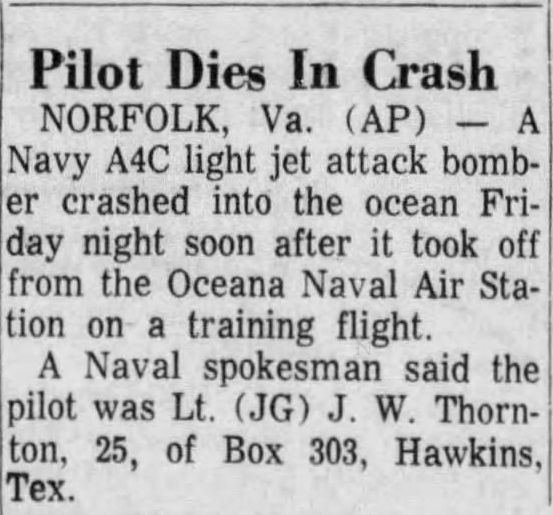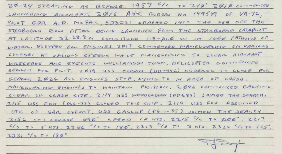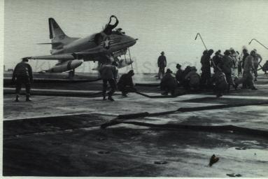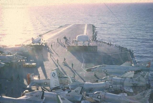 Events June 1, 1955: Attack Squadron SEVENTY-SIX (VA-76) was established. The squadron was assigned the McDonnell F2H-2 Banshee. January 1956: The Spirits were assigned the Grumman F9F-6 Cougar. November to December 1956: During the Suez Crisis VA-76 Spirits were deployed on board USS Forrestal CVA 59, off the coast of the Azores awaiting a call to enter the Mediterranean if necessary. May 1959: The Spirits were assigned the Douglas A4D-2 (A-4B) Skyhawk. January 30, 1960: Lt.(jg) Orrie Griffith Hiett ejected safely from A4D-2 Skyhawk BuNo 145005. One of his most memorable experiences was when his plane caught fire during an in-air refueling maneuver, and he had to bail out into the Caribbean Sea. June 27, 1960: Lt. Gerry L. Stark ejected safely from A4D-2 BuNo 142755. A small fishing vessel yesterday picked up a Navy pilot who ejected from his disabled jet fighter. The plane crashed near Knotts Island, NC. The pilot, Lt. Gerry L. Stark, was unhurt. He was on a training flight from the aircraft carrier Intrepid. A helicopter flew him to NAS Oceana. His plane developed engine trouble. The Progress-Index, Tuesday, June 28, 1960. >June 1961: Deployed on board USS Intrepid CVA 11, in the Caribbean during the Dominican Republic crisis.> 6 Jan 1962: Executive Officer LCDR James T. Peddy, Jr. lost in A-4C BuNo 148454 in an operational launch accident in the Western Mediterranean Sea. 2031 A4D-1 BuNo 148454, pilot LCdr. James T. Peddy crashed into the sea shortly after being launched. Crash location: Lat. 40-23.1N, Long. 13-16.9E. 2033 USS Bordelon (DD-881) dispatched to conduct search. 2145 USS Bordelon (DD-881) recovered parts of aircraft and found positive evidence of pilot's death in crash. 2216 USS Bordelon (DD-881) concluded search. The pilot was not recovered. USS Intrepid deck log, Saturday, 6 January 1962. March 1962: The Spirits were assigned the Douglas A4D-2N (A-4C) Skyhawk. October 19 through December 8, 1962: VA-76 deployed on board United States Ship Enterprise CVAN 65, off Cuba during the Cuban Missile Crisis and naval blockade. January 31, 1964: Lt. J.W. Thornton, 25, was still missing Saturday after his A4C jet (BuNo 148455) crashed in the ocean Friday night shortly after take-off from NAS Oceana on an eastern coast training flight. Lt. Thornton's body has not been recovered. Longview News Journal, Sunday, February 2, 1964. Lt. J.W. Thornton, 25, was killed when his A4C jet crashed in the ocean Friday night shortly after takeoff from NAS Oceana on a training flight. The Montgomery Advertiser, Sunday, February 2, 1964. March 1964: Deployed in the Mediterranean on board USS Enterprise CVAN 65, near Cyprus during Turk-Greek Cypriot crisis. May 29 to June 15, 1965: While temporarily based ashore at Naval Station Roosevelt Roads, Puerto Rico, VA-76 flew armed reconnaissance during crisis in Dominican Republic. October 26, 1965, to June 21, 1966: The first of two VA-76 combat cruises to WestPac-Vietnam. VA-76 flew the A-4C Skyhawk with CVW-9 and struck from USS Enterprise CVAN 65. December 22, 1965: Lt. John Douglas Prudhomme, No. 2 (BuNo 149521) in a four-plane section, was killed when the section made a low-level left turn approach to the Uong Bi power plant, and he was seen to level his wings and fly into the ground. January 2, 1966: Lt.(jg) Donald Clay MacLaughlin (BuNo 147704) KIA, crashed on slope of mountainside in thick fog, Duc Pho, Quang Ngai Province, SVN March 25, 1966: Lt.(jg) Bradley Edsel Smith ejected and was captured when he was hit by AAA while in a shallow dive and his aircraft burst into flames while attacking a road ferry across the Sou Giang River near Bau Khe and Tho Ngoa. On March 25, 1966, he launched as one of a section of three aircraft on an armed reconnaissance mission on the Quang Khe highway ferry in Quang Binh Province, North Vietnam. During the bombing run, radio contact was lost with Smith. His wingman alerted the search and rescue aircraft. There was no trace of aircraft wreckage or fire. No flak was observed in the target area during the bombing runs. Radio Hanoi broadcast later reported that North Vietnamese forces shot down one U.S. aircraft on March 25 over Quang Binh City, and that the pilot had been captured. May 11, 1966: Attack Squadron SEVENTY-SIX Commanding Officer, Cdr. J. B. Linder, awarded Silver Star for leading a strike against a mobile SAM site at Thanh Hoa, North Vietnam. December 6, 1966: VA-76 Commanding Officer, Cdr. Albert D. McFall, perished in A-4C BuNo 149549 following a night catapult launch from USS Bon Homme Richard CVA 31. Long Beach, CA Press-Telegram. 2016 A4C BuNo 149549 of VA-76, pilot CDR A.D. McFall, crashed into the sea off the starboard bow after being launched from the starboard catapult at Latitude 32-28.8N Longitude 118-01.0W in 1,000 fathoms of water. Stopped all engines. 2017 Commenced maneuvering on various courses at various speeds while maneuvering to clear aircraft wreckage and execute Williamson turn. Helicopter commenced search for pilot. 2019 USS Edson (DD-946) ordered to close for search. 2026 All engines stop. Lying to in area of crash. Maneuvering engines to maintain position. 2046 commenced backing clear of crash site. 2114 USS Wedderburn (DD-684) joined the search. 2115 USS Fox (DLG-33) closed this ship. 2119 USS Fox assumed OTC of SAR effort. USS Gallup (PGM-85) joined the search. USS Bon Homme Richard CVA-31 deck log, Tuesday 06 December 1966. January 26, 1967, to August 25, 1967: The second of two VA-76 combat cruises to WestPac-Vietnam. VA-76 flew the A-4C Skyhawk with CVW-21 and struck from USS Bon Homme Richard CVA 31. April 25, 1967: Lt. Charles David Stackhouse ejected and was captured when he was shot down by a MiG-17 during an attack on POL and ammo storage sites at Haiphong. I had dropped my bombs and was in the process of shooting a MiG 17 on my wingman's tail while another MiG was shooting at me. The second time he hit me I started rolling ... I was already on fire from the first hit f