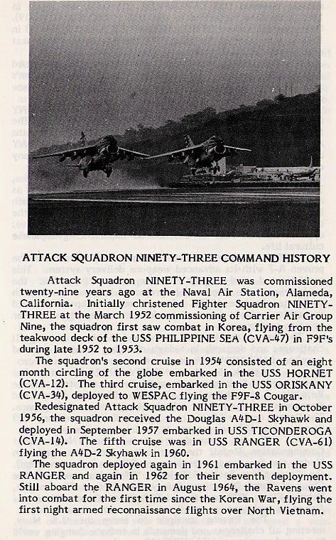 1954 to 1976: Blue Blazers 1976 to 1986: Ravens (Fighting Ravens) Heritage 26 MAR 1952: Fighter Squadron NINETY THREE (VF-93) established. 15 SEP 1956: VF-93 was redesignated Attack Squadron NINETY THREE (VA-93). 31 AUG 1986: Attack Squadron NINETY THREE (VA-93) was disestablished. |