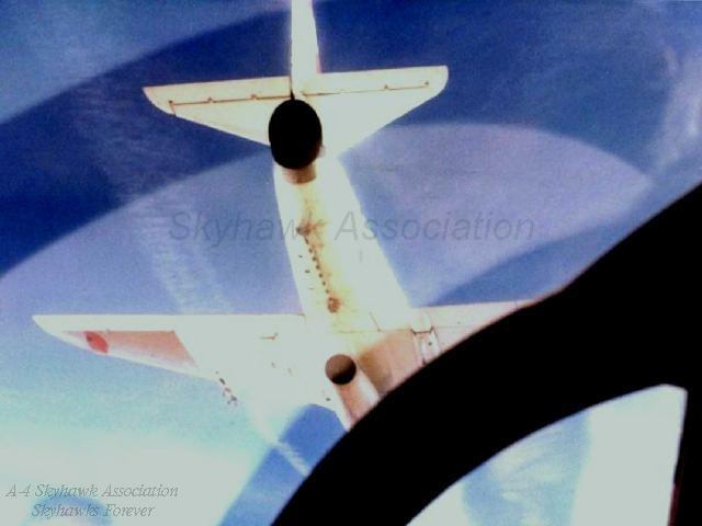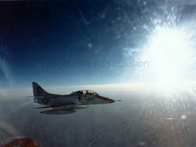 OCT 1979: in-flight view of Bobcats Skyhawk BuNo 153478, C-400, Commander Training Wing Three, CAPT T.C. Wimberly. J.W. Alber.