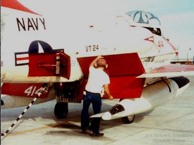 1981: VT-24 Plane Captain. VT-24 Plane Captain preparing and checking a TA-4J for a student's flight. Pictures from Ford J. Lauer III.