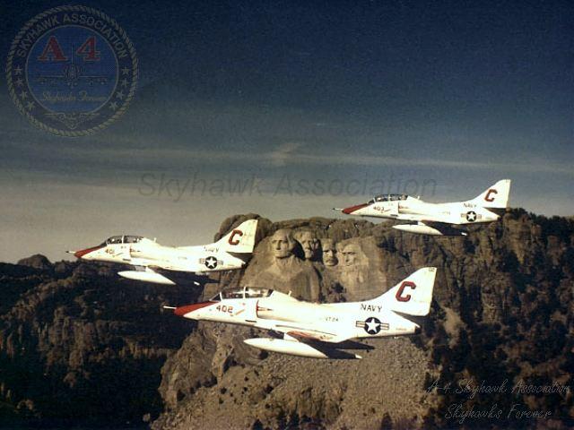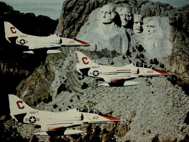 1980: George, Tom, Teddy, Abe and the Three Bobcats. Three Bobcat TA-4J Skyhawks fly formation past George, Tom, Teddy and Abe at Mount Rushmore, South Dakota. The lead Skyhawk is side number C-401; Wingman is TA-4J Skyhawk BuNo. 158520 side number C-402; And 'ol "Tail End Charlie" is Skyhawk BuNo. 158524 side number C-403. USN picture from Ford J. Lauer III.