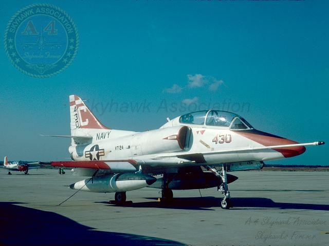 1981: VT-24 Bobcat Skyhawk BuNo. 154287. TA-4J Skyhawk BuNo. 154287, side number C-444, of the VT-24 "Bobcats" from Naval Air Station Chase Field, Texas, photographed on display at the Naval Air Station Atlanta airshow, July 5, 1981. This Scooter bears the relatively (for Training Command) uncommon gray and white scheme. From a photograph by Frank J. Mirande.