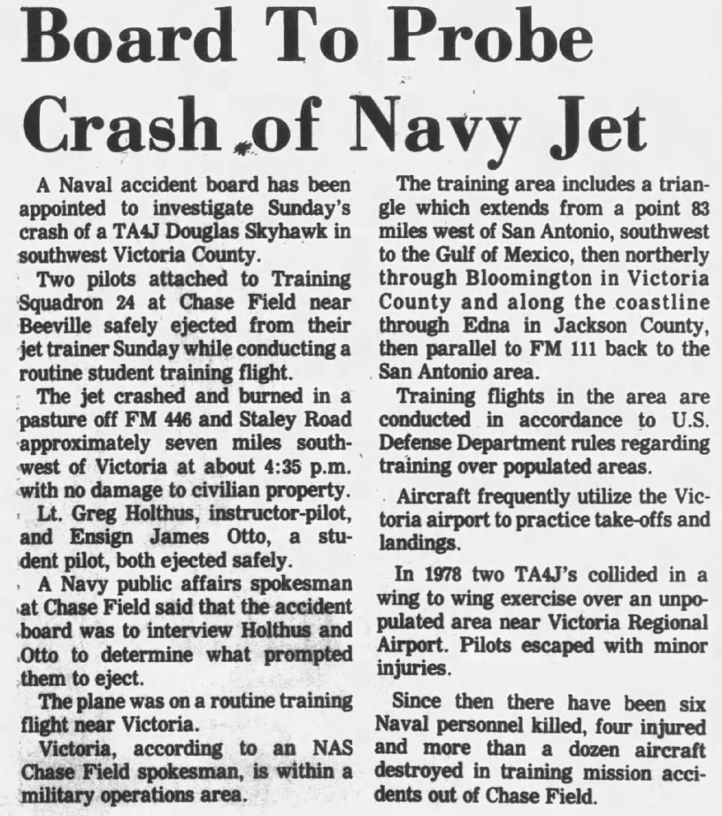 May 4, 1986: Lt. Greg Holthus (IP) and Ens. James Otto (student) ejected safely when their VT-24 TA-4J Skyhawk (BuNo 153460) crashed near Victoria, TX Sunday while on a routine training flight. The jet crashed and burned in a pasture off FM 446 and Staley Road approximately seven miles SE of Victoria at about 4:35 p.m. The Victoria Advocate, Tuesday, May 6, 1986. VT-24 TA-4J BuNo 153460 was destroyed at Chase Field when aircraft departed from controlled flight during zero airspeed maneuver. 04 May 1986. 0 fatalities. Naval Safety Center via Jim Winchester.